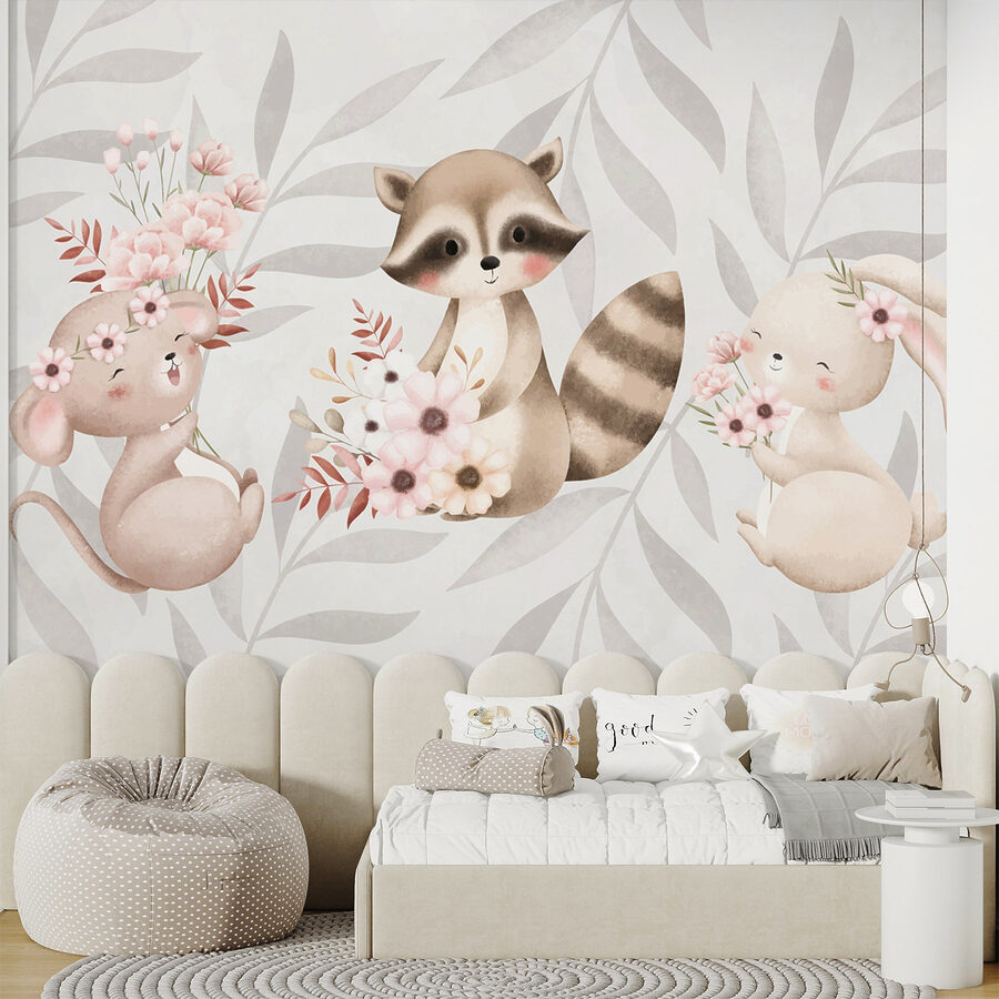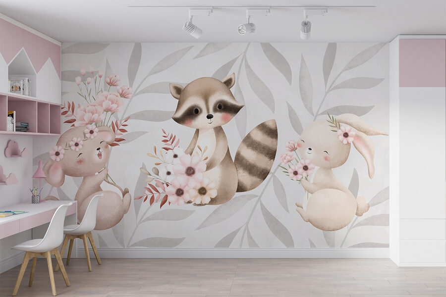 Transformați un perete plictisitor într-un paradis capricios cu această pictură murală încântătoare cu un raton și un iepure, fiecare ținând un buchet de flori. Este ca și cum ai aduce o mică bucată de natură în casa ta, unde aceste creaturi fermecătoare par să prindă viață chiar în fața ochilor tăi. Imaginați-vă că pășiți într-o cameră și simțiți zâmbetele instantanee ale oaspeților dvs. Tonurile neutre și grafica moale creează o atmosferă confortabilă, perfectă pentru camere de copii, camere de joacă sau chiar acel colț de lectură liniștit pe care tot intenționați să îl amenajați. Fiecare privire aruncată asupra acestor animale adorabile poate stârni puțină bucurie, amintindu-vă că, uneori, viața se rezumă la lucrurile mărunte – cum ar fi florile și prietenii blănoși. Este un starter de conversație, un strop de veselie și, sincer, cine ar putea rezista acestor fețe drăguțe?