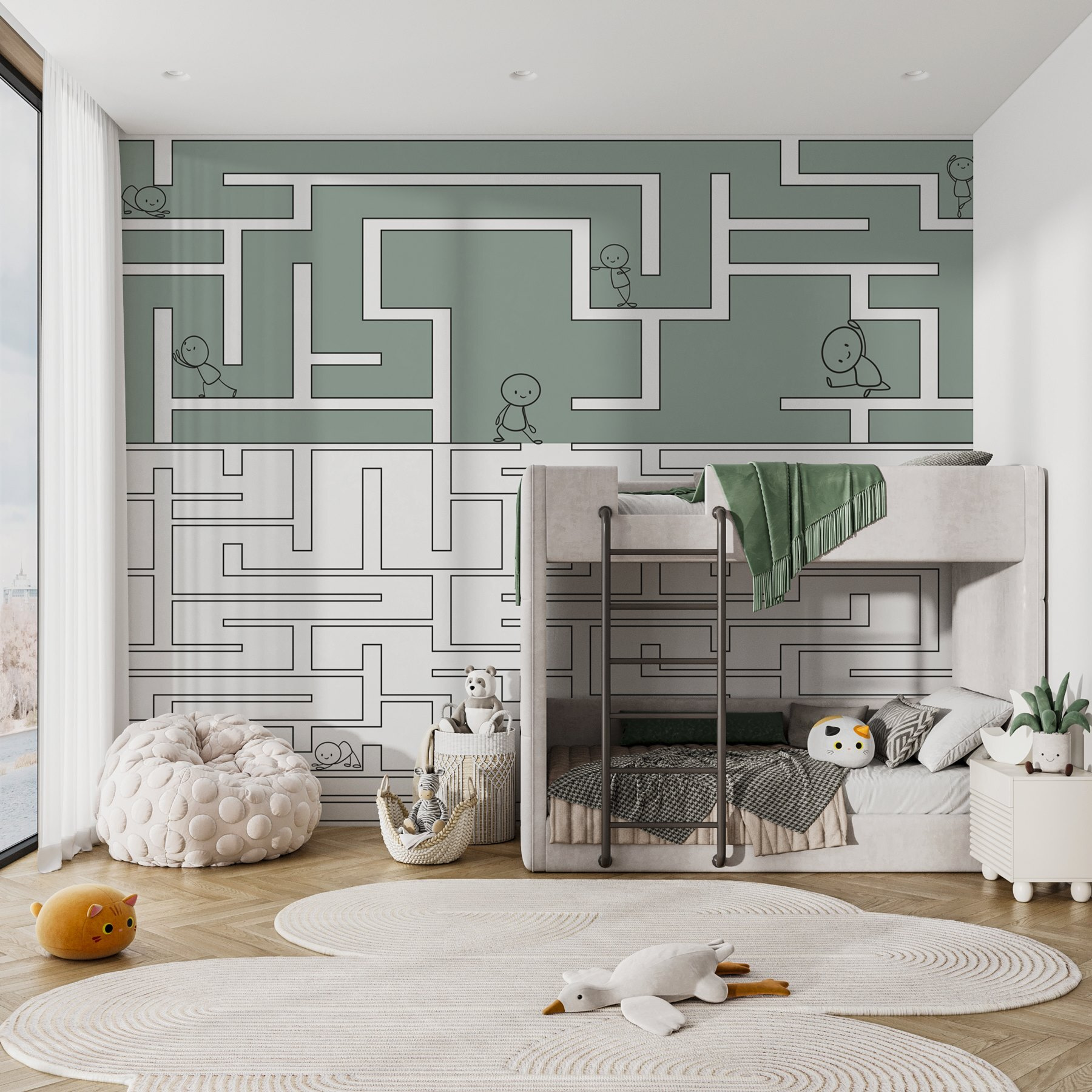 Transformați spațiul unui copil într-o aventură jucăușă cu această pictură murală capricioasă care prezintă un joc de labirint și personaje de desene animate vesele. Imaginați-vă că cei mici își trasează cu nerăbdare degetele de-a lungul căilor în timp ce se prefac că își ghidează drumul prin tot felul de escapade amuzante. Paleta de culori suave păstrează calmul, în timp ce designul dinamic al labirintului stârnește curiozitatea. Nu este doar decor; este un fundal pentru jocul imaginativ și povestirea. Perfectă pentru dormitoare sau camere de joacă, această pictură murală invită la râs, creativitate și puțină competiție prietenoasă. Priviți cum copiii se pierd în distracție!