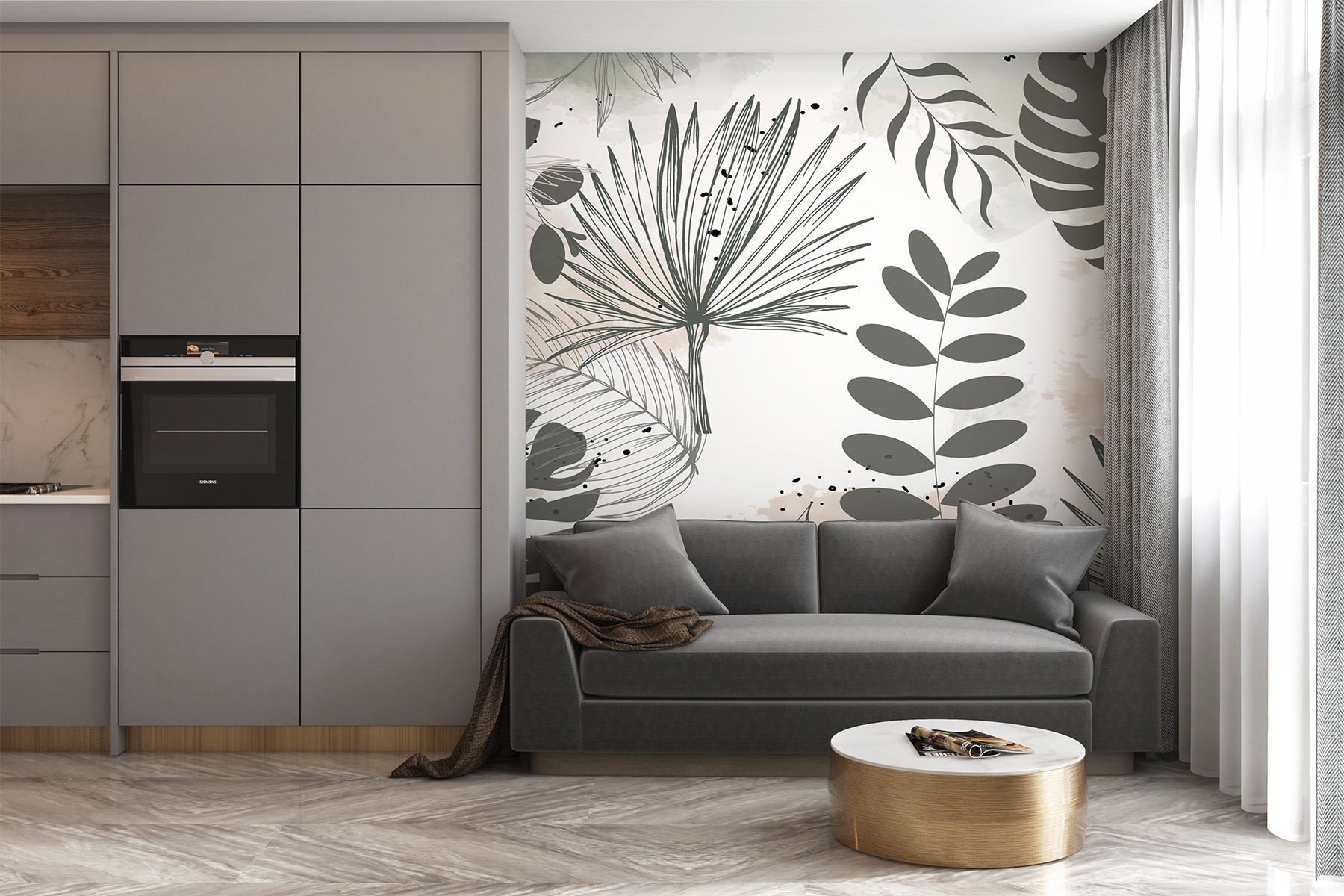 Transformați orice cameră într-o evadare liniștită cu această pictură murală botanică inspirată din natură. Imaginați-vă că vă treziți la un dans moale de frunze verzi și tușe jucăușe. Este ca și cum ai aduce aerul liber în casă, fără gândaci – din fericire! Paleta liniștitoare de tonuri pământii se potrivește fără efort cu orice decor, fiind ușor de asortat. Fie că este vorba de un colț de lectură confortabil sau de o zonă de luat masa plină de viață, această pictură murală șoptește “relaxare”. Oaspeții vor zăbovi, admirând atmosfera relaxată și, cine știe, poate va stârni o conversație despre escapade tropicale și vacanțe de vis!