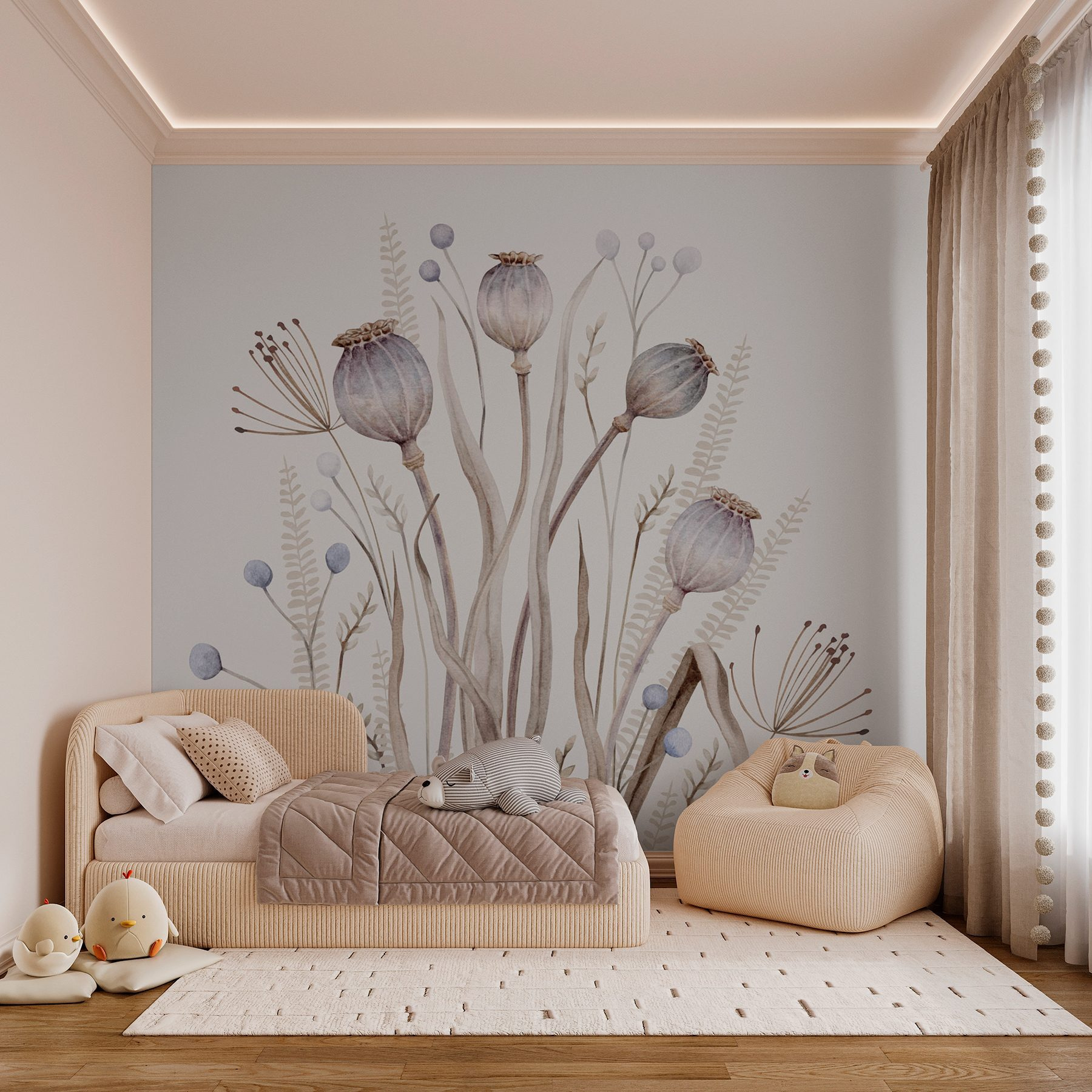 Transformați orice cameră într-o grădină senină cu această pictură murală încântătoare în acuarelă cu flori și plante. Aceasta aduce un strop de natură direct pe pereții dvs., șoptindu-vă eleganță suavă și farmec răcoritor în spațiul dvs. Imaginați-vă că vă plimbați printr-o pajiște liniștită în fiecare dimineață în timp ce sorbiți cafeaua – sună de vis, nu-i așa? Culorile blânde creează o atmosferă liniștită, făcând-o perfectă pentru colțuri confortabile sau camere de zi vibrante. S-ar putea chiar ca prietenii să zăbovească doar pentru a vă admira decorul șic. Simplu, elegant și primitor, acest mural este ca o gură de aer proaspăt – fără alergii!