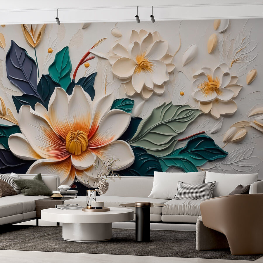 Transformați-vă spațiul cu această minunată pictură murală cu flori albe și galbene cuibărită printre frunze verzi luxuriante. Este ca și cum ai aduce o grădină chiar în sufrageria ta – fără a mai fi nevoie să uzi. Imaginați-vă cum această frumusețe va înveseli un perete plictisitor, adăugând o atmosferă proaspătă, primitoare și veselă. Prietenii vor intra, o vor admira și se vor întreba dacă ați descoperit secretul vieții Zen. Designul detaliat joacă ușor feste ochilor, făcându-l o plăcere de explorat. Perfect pentru orice cameră, acesta invită căldura, creativitatea și un strop de bucurie în viața de zi cu zi. Cine nu și-ar dori asta?
