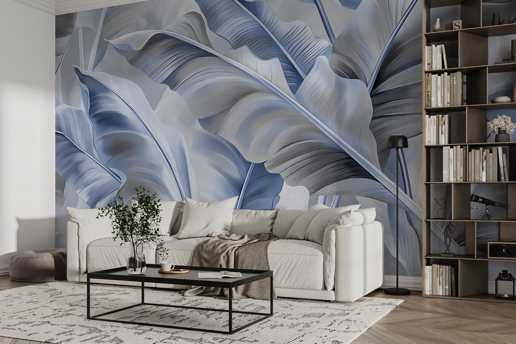 Transformarea unui spațiu poate părea o mini-aventură, iar această pictură murală cu frunze albastre elegante este exact ceea ce trebuie. Imaginați-vă că pășiți într-o cameră în care natura se întâlnește cu arta, cu frunzișul moale, abstract, care vă învăluie într-o îmbrățișare liniștitoare. Tonurile reci de albastru creează o atmosferă liniștitoare, perfectă pentru a vă relaxa după o zi lungă sau pentru a crea atmosfera potrivită pentru o întâlnire confortabilă. Este ca și cum ai avea o grădină în interior, fără a uda. În plus, acele curbe blânde și forme curgătoare? Practic șoptesc relaxare. Oaspeții ar putea crede chiar că sunteți un fel de vrăjitor al designului. Această pictură murală nu numai că decorează, ci îți transformă spațiul în ceva proaspăt și primitor. Este cu siguranță un starter de conversație. Cine nu ar vrea să vorbească despre aceste frunze uimitoare?