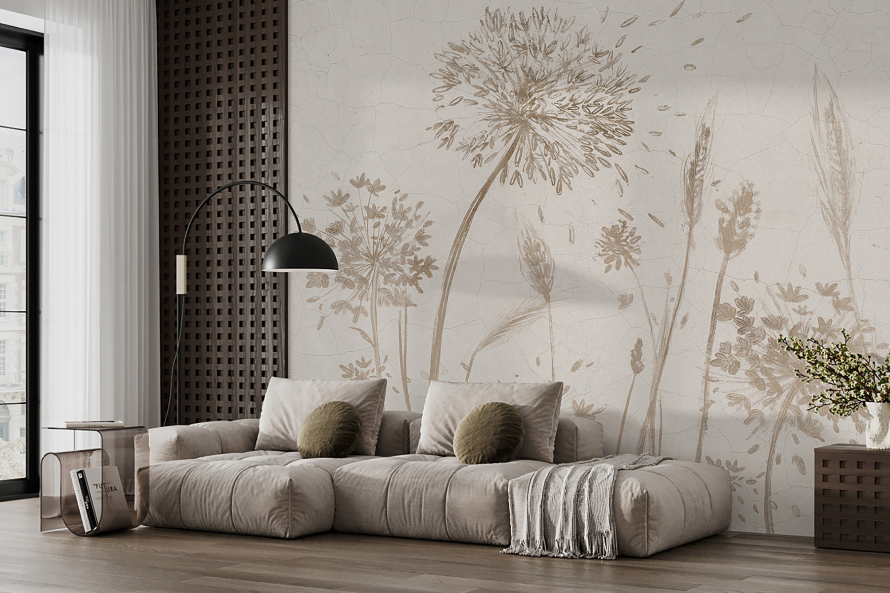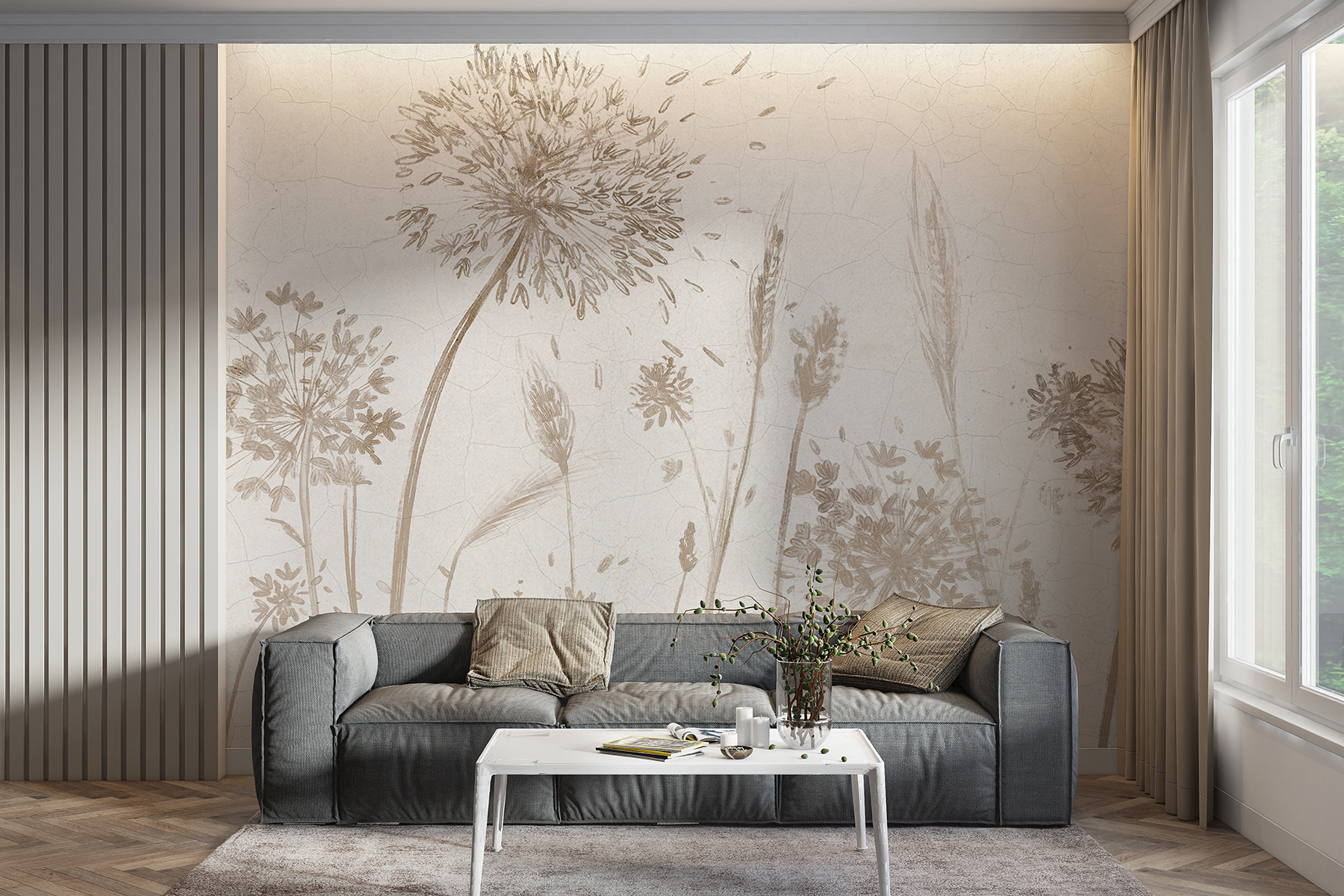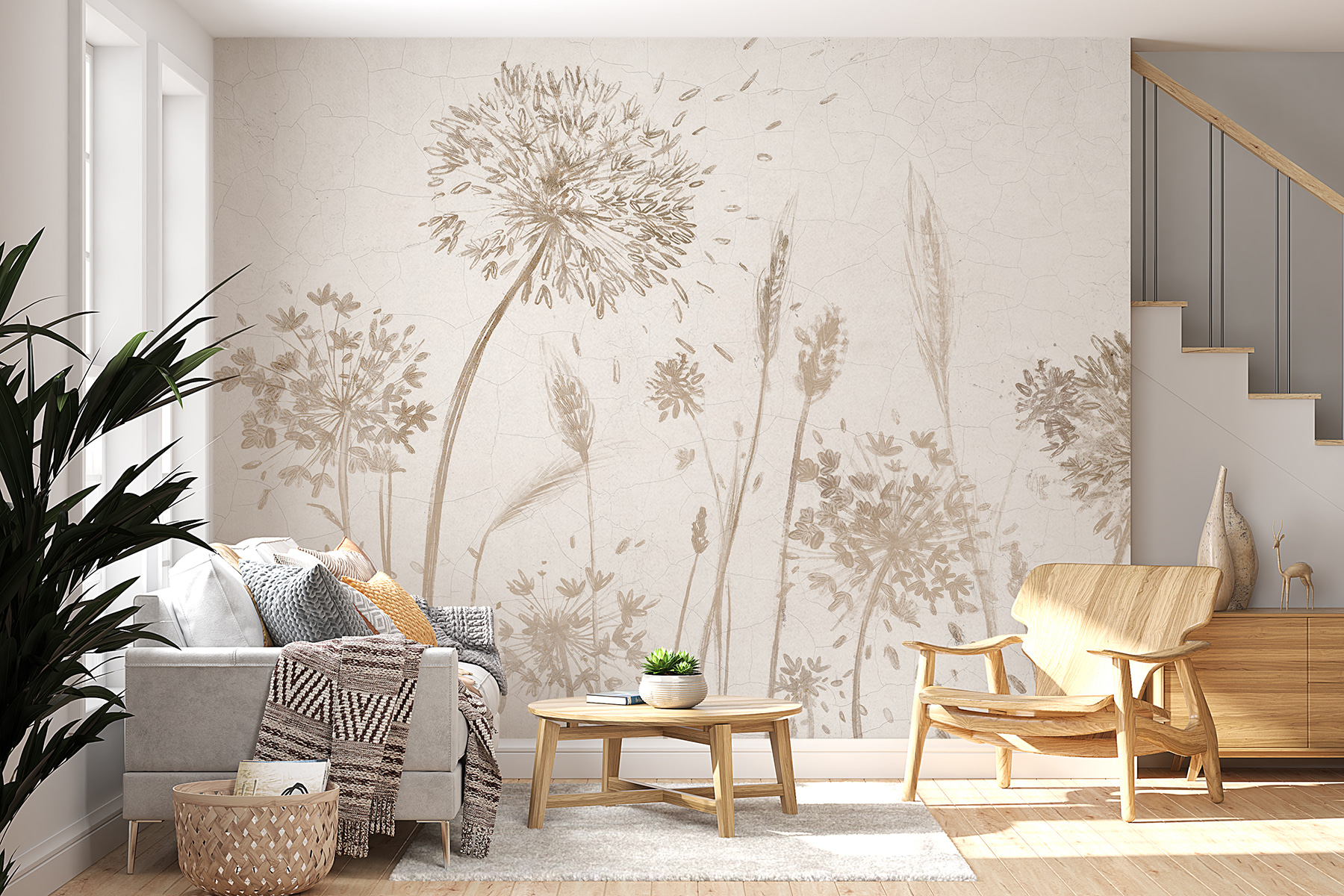 Imaginați-vă că aduceți calmul și frumusețea naturii direct în camera dvs. Asta este ceea ce face “Fototapet w07921” – este ca o gură de aer proaspăt pentru pereții dumneavoastră. Imaginați-vă flori sălbatice delicate și păpădii grațioase, schițate cu blândețe în maro și bej, legănându-se ca într-o briză de vară. Crăpăturile din fundal îi conferă acel farmec rustic, de epocă, ca și cum ar fi fost sărutat de timp…