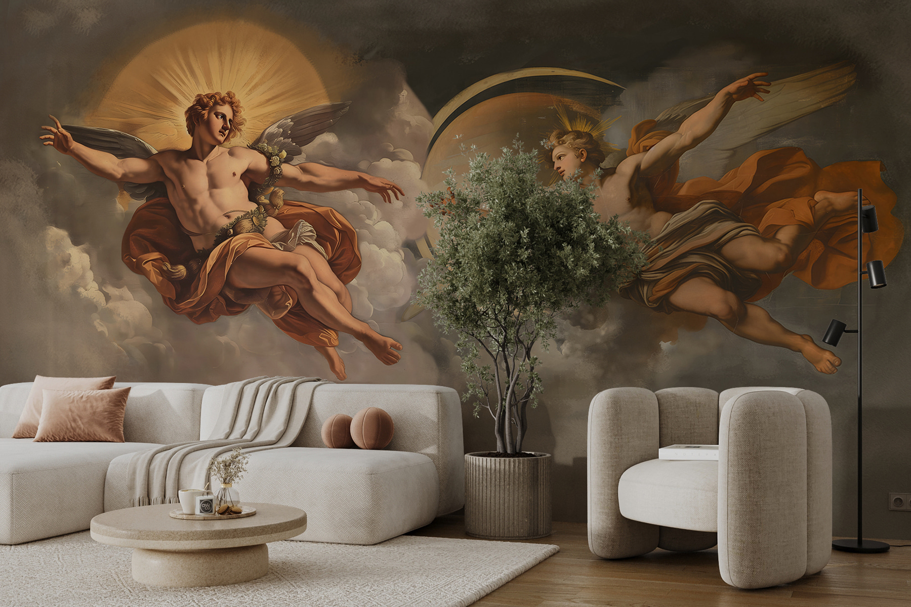 Intrați într-o lume a minunilor cu “Fototapet w08137”. Imaginați-vă că vă treziți în fiecare dimineață sub strălucirea celestă a acestei picturi murale uimitoare – este ca și cum ați avea o felie de rai chiar în casa dumneavoastră! Cu nuanțe uluitoare de lumină naturală și nori de vis, aceasta îmbină fără efort arta clasică cu magia modernă. Imaginați-vă două figuri întinzându-se peste timp și spațiu, prezența lor puternică și senină aducând un sentiment de pace și uimire.
