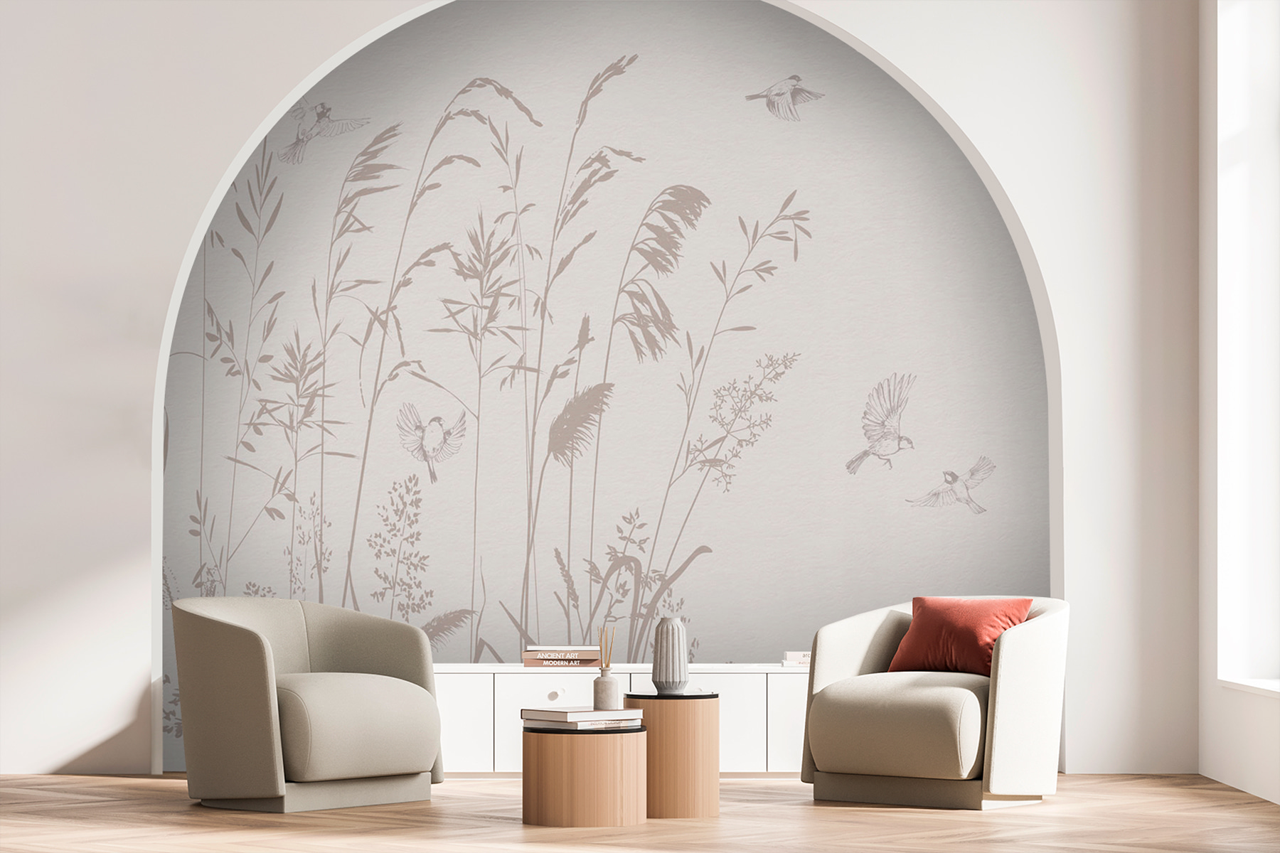 Și păsările acelea! Sunt împrăștiate ca mici note de bucurie, adăugând viață și mișcare pereților tăi. Această pictură murală are un mod de a face totul să pară calm și proaspăt, dar și subtil vibrant. Nu solicită atenție – ci o invită cu amabilitate. Ideală pentru cei care iubesc să simtă natura fără să iasă afară.