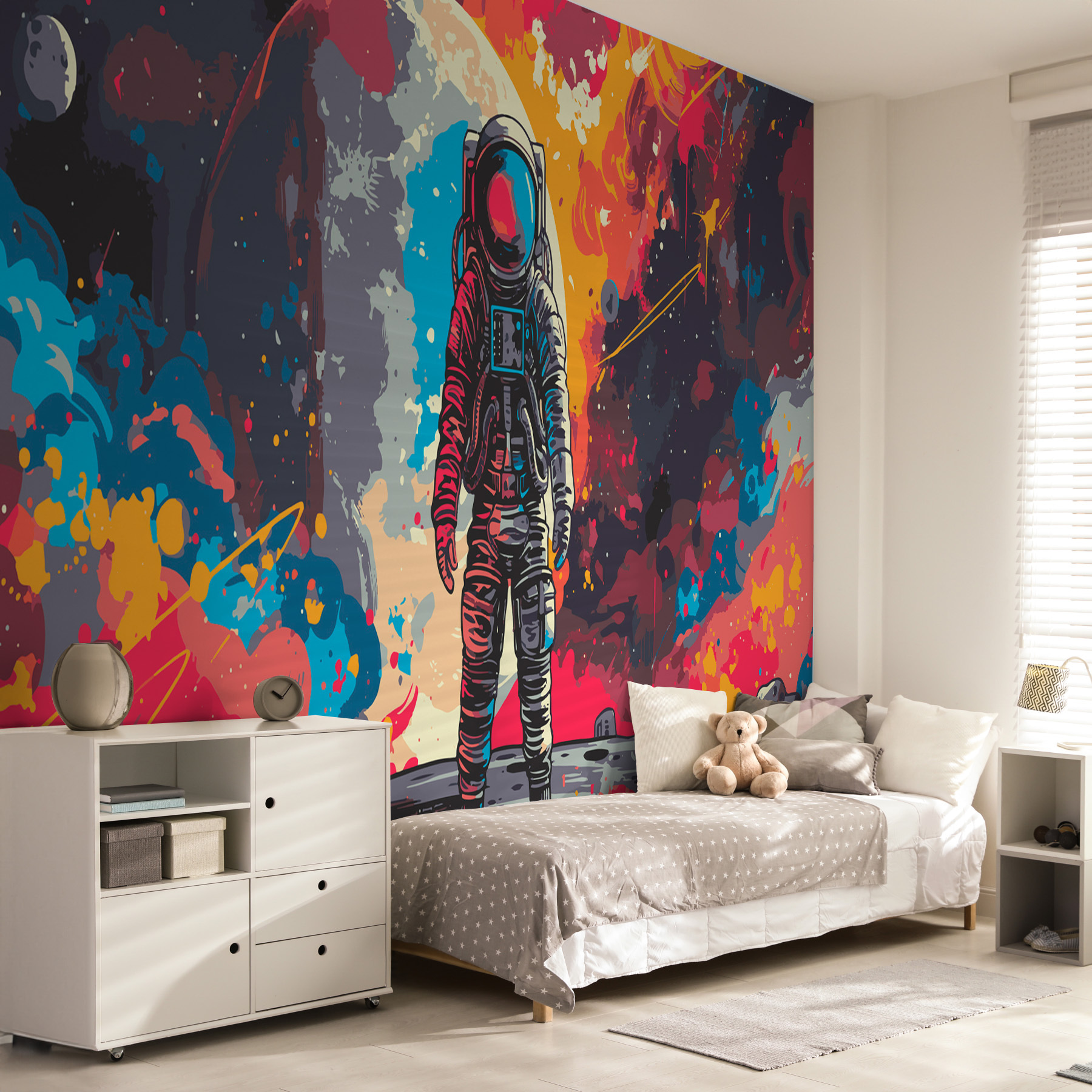 Imaginați-vă un astronaut, desprins din cele mai nebunești vise spațiale, care stă în fața unei explozii de decor interstelar. Este ca o petrecere de dans cosmic de fiecare dată când te uiți la ea! Perfect pentru oricine dorește să adauge un element de mirare și posibilități nelimitate camerei sale. Copii, adulți – toată lumea se va pierde în vibrațiile sale fermecătoare de galaxie. Este genul de pictură murală care te face să te gândești, să visezi și poate chiar să planifici o călătorie spre stele!