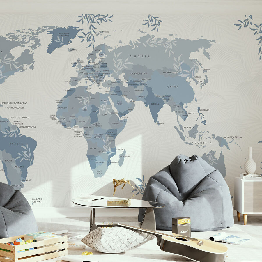 Bună ziua! Uitați-vă la această minunată imprimare murală, cunoscută sub numele de “Fototapet w08211v4”. Gândiți-vă la ea ca la o combinație perfectă între o hartă a lumii și o operă de artă – frumos, nu? Se încadrează în categoriile “Murale de perete cu hărți ale Pământului” și “Murale de perete populare”. Cu nuanțele sale liniștitoare de albastru și gri, este ca o aventură globală blândă pentru pereții dumneavoastră. Frunzele pictate plutesc deasupra continentelor, făcând din aceasta nu doar o hartă, ci o călătorie capricioasă. Imaginați-vă sorbindu-vă cafeaua de dimineață, trasând cu degetul peste locuri îndepărtate, visând la următoarea călătorie… sau amintindu-vă de ultima. Această pictură murală este perfectă pentru oricine are poftă de călătorii sau adoră să își condimenteze decorul cu ceva unic. Va transforma orice cameră într-un starter de conversație instant – cine știe unde vă va duce următoarea poveste? 🌿🌍