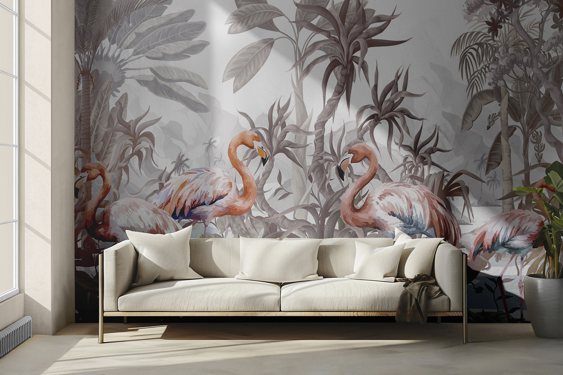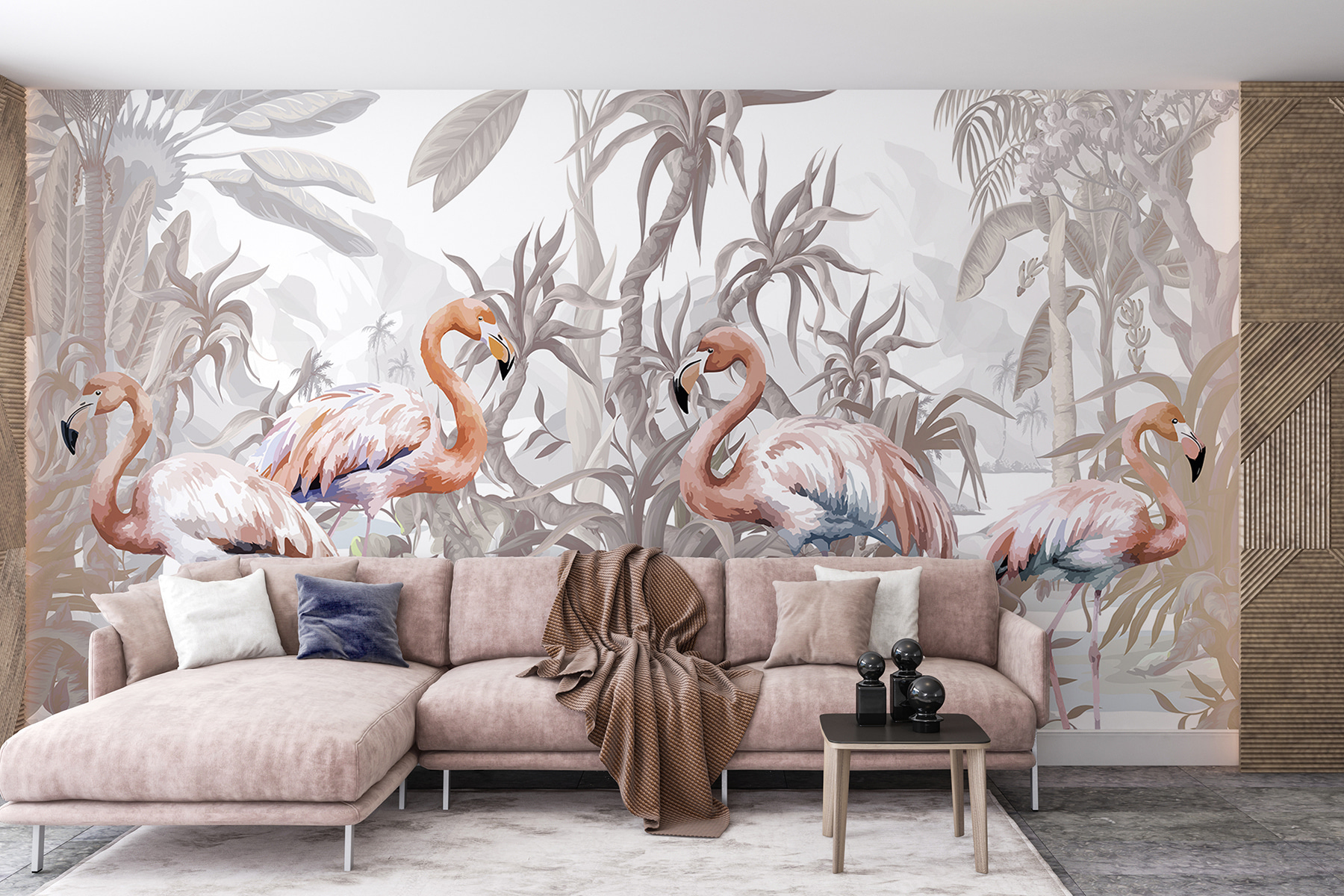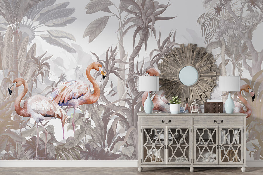 Intrați într-o lume capricioasă cu acest flamingo mural. Imaginați-vă că vă sorbiți cafeaua de dimineață în timp ce aceste păsări elegante, cocoțate în mijlocul frunzelor tropicale luxuriante, vă înveselesc spațiul. Nuanțele suave creează o atmosferă senină, aproape ca și cum ați fi într-o mini-vacanță în fiecare zi. Perfect pentru a adăuga un strop de natură în camera de zi sau în dormitor. Este ca și cum ai avea o felie ascunsă de paradis chiar pe peretele tău. Cine ar fi crezut că flamingo pot fi cei mai buni prieteni de decor? Sofisticarea penelor întâlnește farmecul relaxat.
