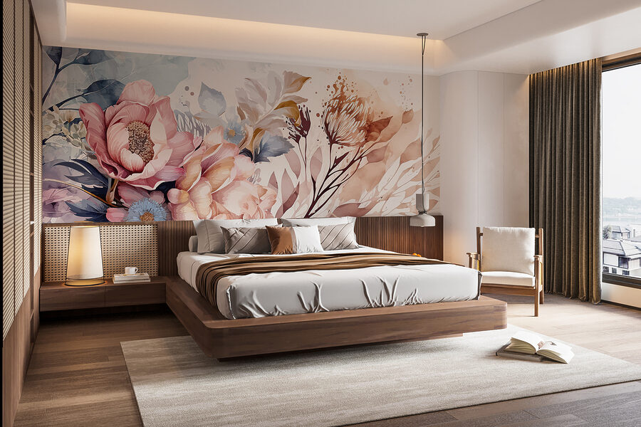 Imaginați-vă asta: intrați într-o cameră și bam! Această pictură murală vă întâmpină cu vârtejurile sale luxuriante de flori și frunze. Este ca și cum ai păși într-o grădină de vis în acuarelă – doar că, știi tu, fără insecte. Perfect pentru a adăuga un strop de natură, fără a fi nevoit să uzi plantele. Are o atmosferă confortabilă, ca și cum te-ai înfășura în pătura preferată în timp ce bei ceai. Prietenii ar putea trece pe aici doar pentru a se minuna de flerul artistic. Este farmecul naturii, capturat și imprimat – gata să transforme orice perete într-o poveste.