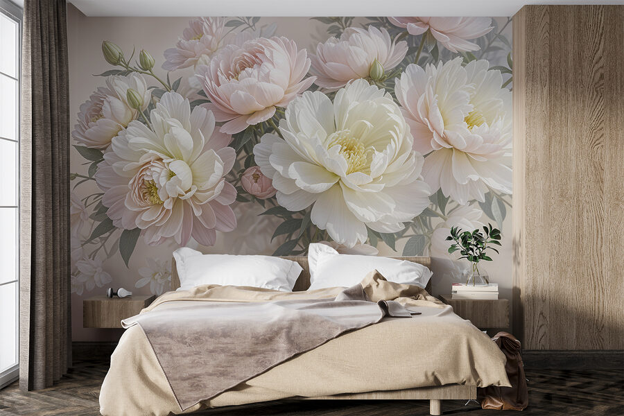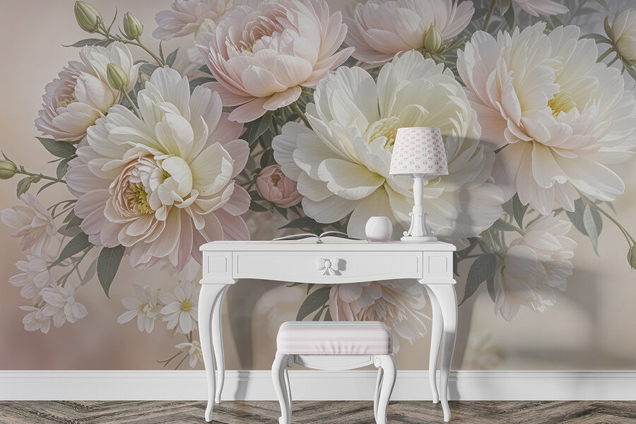 Imaginați-vă că intrați într-o cameră și sunteți întâmpinați de această mare visătoare de flori albe și roz – ca și cum ați păși într-o grădină de basm! Această pictură murală șoptește eleganță și veselie, nu-i așa? Perfectă pentru a transforma orice spațiu plictisitor într-un paradis senin. Imaginează-ți că te trezești cu aceste bujori uriașe care te cuprind într-o îmbrățișare florală suavă. Este ca și cum natura ar fi decis să campeze pe peretele tău. Perfectă pentru visători și iubitori de flori deopotrivă, este o îmbrățișare artistică confortabilă care așteaptă să vă însenineze ziua. Adăugați un scaun confortabil, o carte bună și lăsați florile să își facă magia!