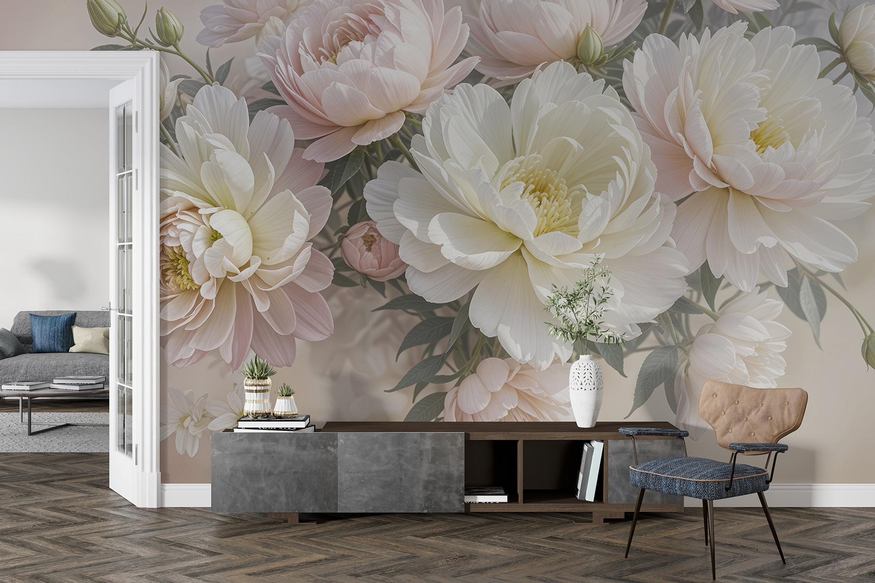 Imaginați-vă că intrați într-o cameră și sunteți întâmpinați de această mare visătoare de flori albe și roz – ca și cum ați păși într-o grădină de basm! Această pictură murală șoptește eleganță și veselie, nu-i așa? Perfectă pentru a transforma orice spațiu plictisitor într-un paradis senin. Imaginează-ți că te trezești cu aceste bujori uriașe care te cuprind într-o îmbrățișare florală suavă. Este ca și cum natura ar fi decis să campeze pe peretele tău. Perfectă pentru visători și iubitori de flori deopotrivă, este o îmbrățișare artistică confortabilă care așteaptă să vă însenineze ziua. Adăugați un scaun confortabil, o carte bună și lăsați florile să își facă magia!