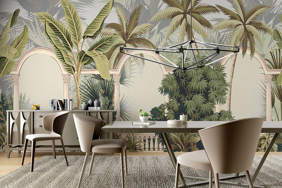 Imaginați-vă că intrați în camera dvs. și simțiți că ați pășit într-o oază tropicală senină. Această pictură murală, cu palmierii săi grațioși care se leagănă ușor de arcadele elegante, creează această senzație fără efort. Este ca propria ta mică evadare – o fereastră către o junglă luxuriantă fără să ieși din casă. Perfect pentru a adăuga o notă de natură și un strop de aventură spațiului tău. Cine ar fi crezut că un perete poate fi biletul tău spre paradis? Adăugați niște scaune confortabile și s-ar putea să vă pierdeți visând cu ochii deschiși la brizele insulei.