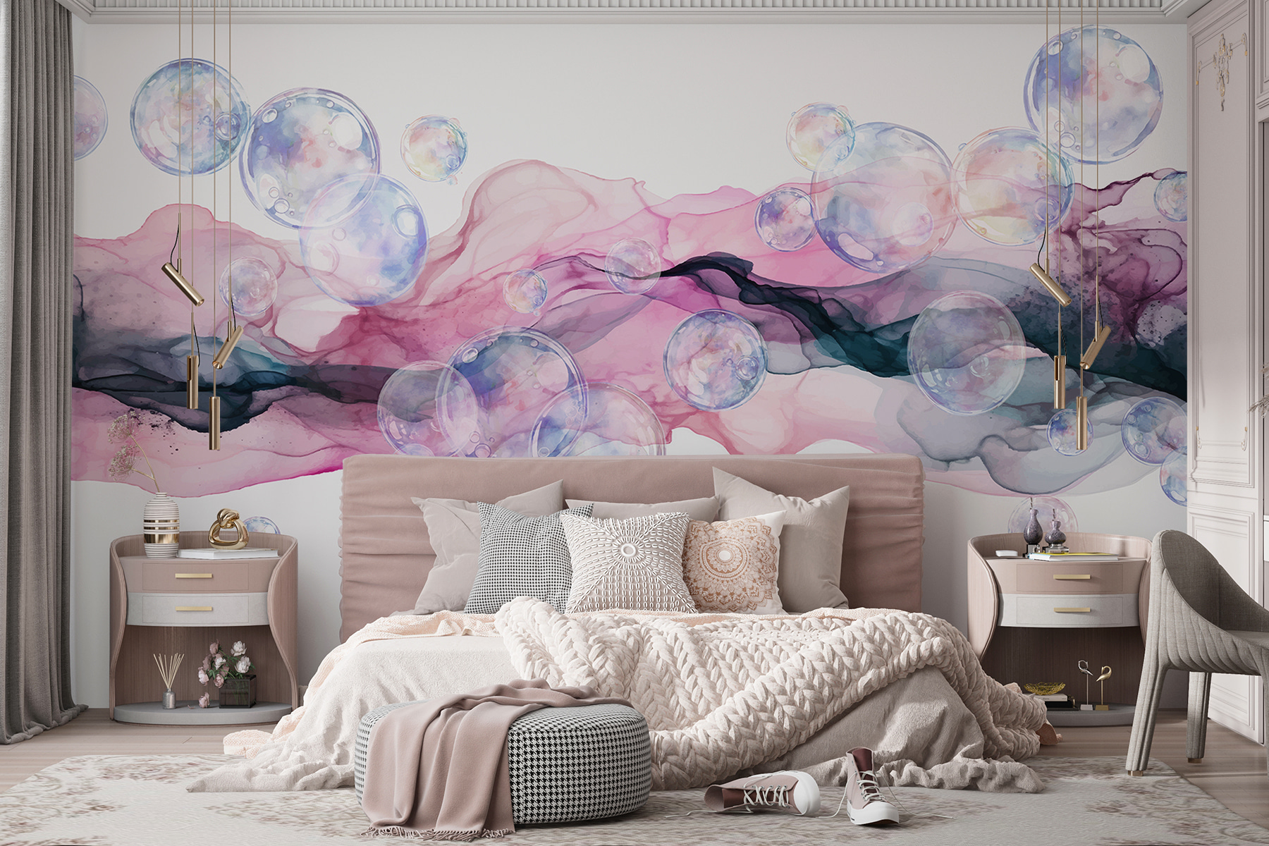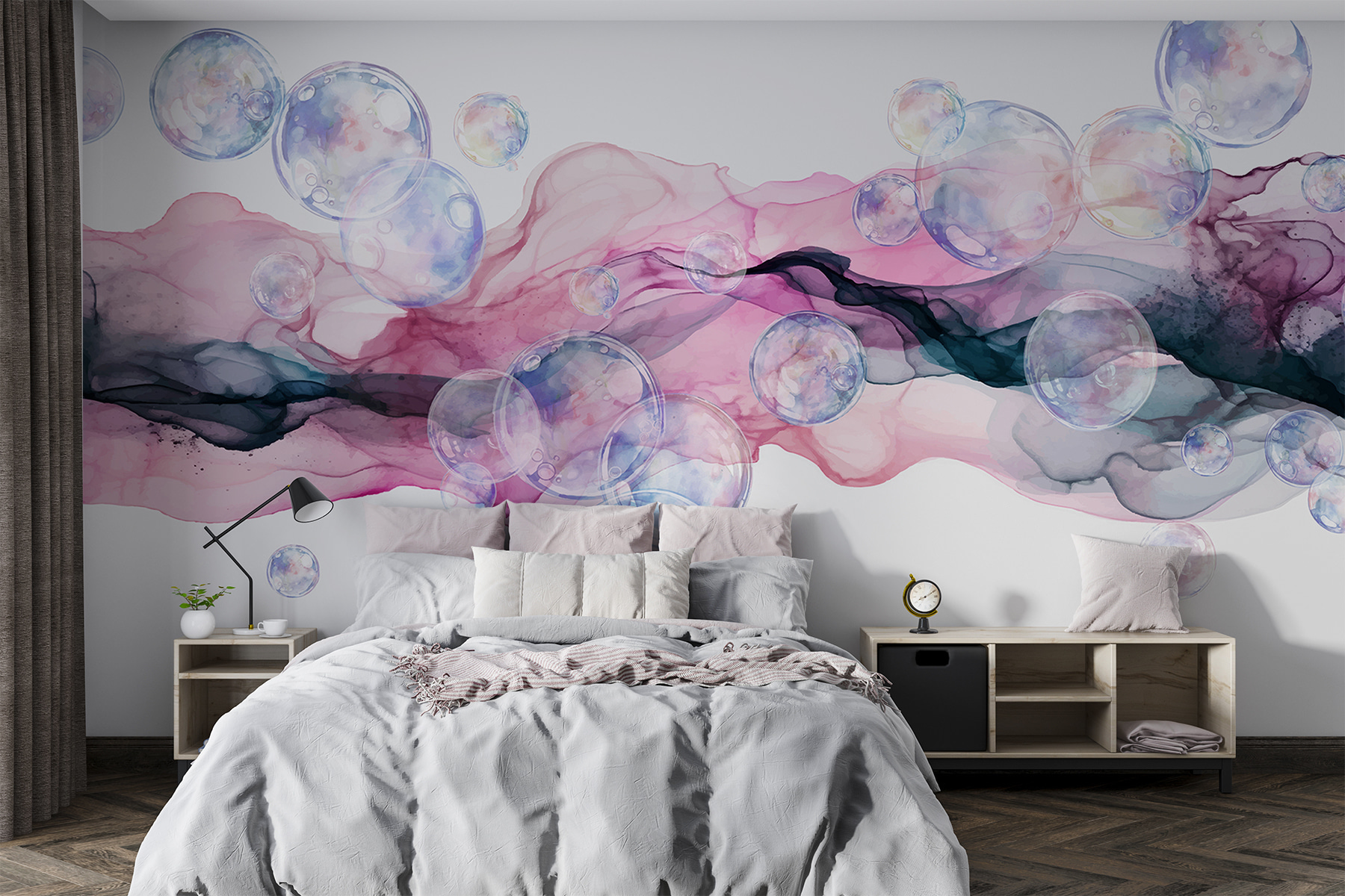 Imaginați-vă un vis cu ochii deschiși devenit tangibil – această pictură murală este magie pură. Aceste bule, ca niște șoapte suave, plutesc într-un dans fermecător de roz și purpuriu. Ați simțit vreodată că pășiți într-o pictură în acuarelă? Iată șansa ta. Camera ta ar putea fi o oază liniștitoare sau un univers capricios, în care creativitatea pur și simplu curge. Simțiți cum vă învăluie seninătatea pe măsură ce lumina atinge aceste nuanțe delicate, aruncând reflexii blânde. Perfect pentru oricine crede în frumusețea imaginației – și cine nu are nevoie de un pic mai multă fantezie în viața sa?
