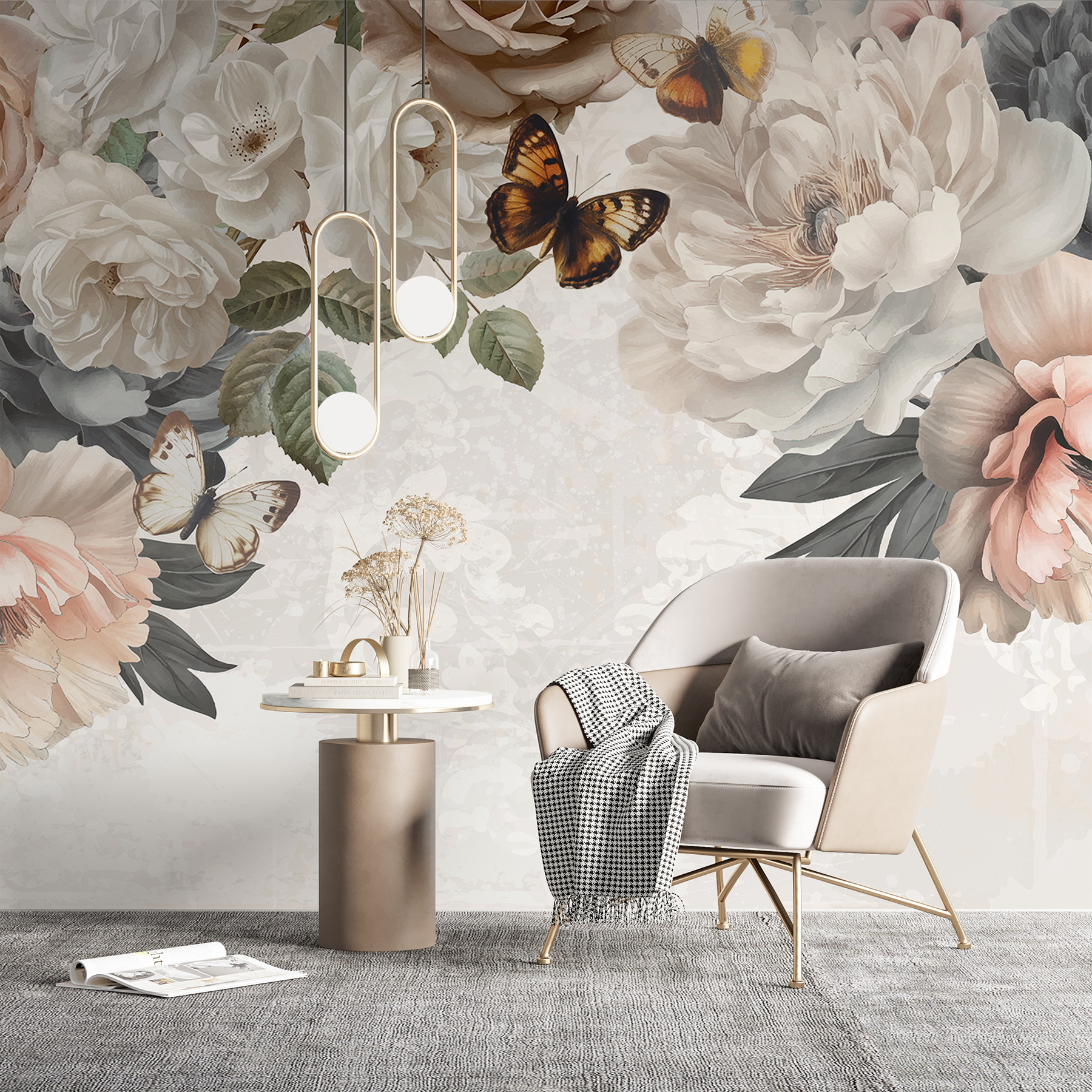 Imaginați-vă că intrați într-o cameră și simțiți că tocmai ați pășit într-o grădină de vis, cu o briză ușoară pe față. Această pictură murală “Grup de flori cu fluturi” nu este doar decor – este o evadare. Trandafirii și bujorii dansează în jur, în timp ce fluturii fluturători adaugă o notă de fantezie. Perfect pentru toți cei care cred că pereții ar trebui să facă mai mult decât să susțină acoperișul – ar trebui să șoptească și povești. Face ca viața de zi cu zi să pară mai puțin obișnuită și mult mai frumoasă. Ideal pentru spațiile care doresc un strop din farmecul naturii!