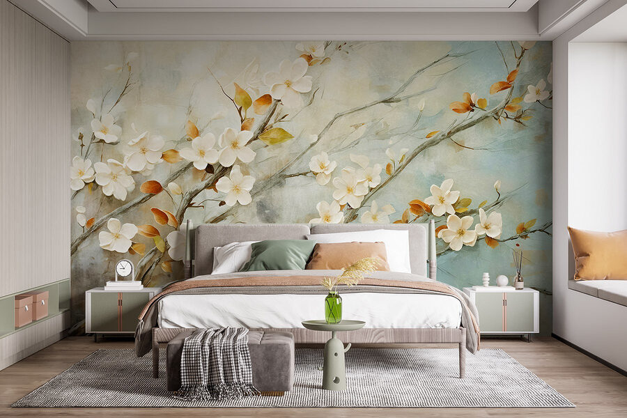 Înveseliți orice perete cu această pictură murală uimitoare, cu ramuri delicate împodobite cu flori albe care par să danseze pe suprafață. Este ca și cum ai aduce o grădină japoneză liniștită chiar în casa ta, fără să ai nevoie de mănuși de grădinărit. Imaginați-vă că intrați într-o cameră și sunteți întâmpinați de aceste flori – este un memento că frumusețea este peste tot, chiar și în interior. Culorile blânde și formele delicate creează o atmosferă senină, perfectă pentru diminețile confortabile cu cafea sau pentru momentele în care doriți doar o mică evadare. În plus, este mai elegantă decât o plantă în ghiveci și nu va trebui să vă faceți griji că uitați să o udați. Îmbrățișați farmecul naturii și lăsați această pictură murală să vă transforme spațiul într-o oază de liniște. Este o artă murală la fel de ușoară ca perechea ta preferată de papuci!