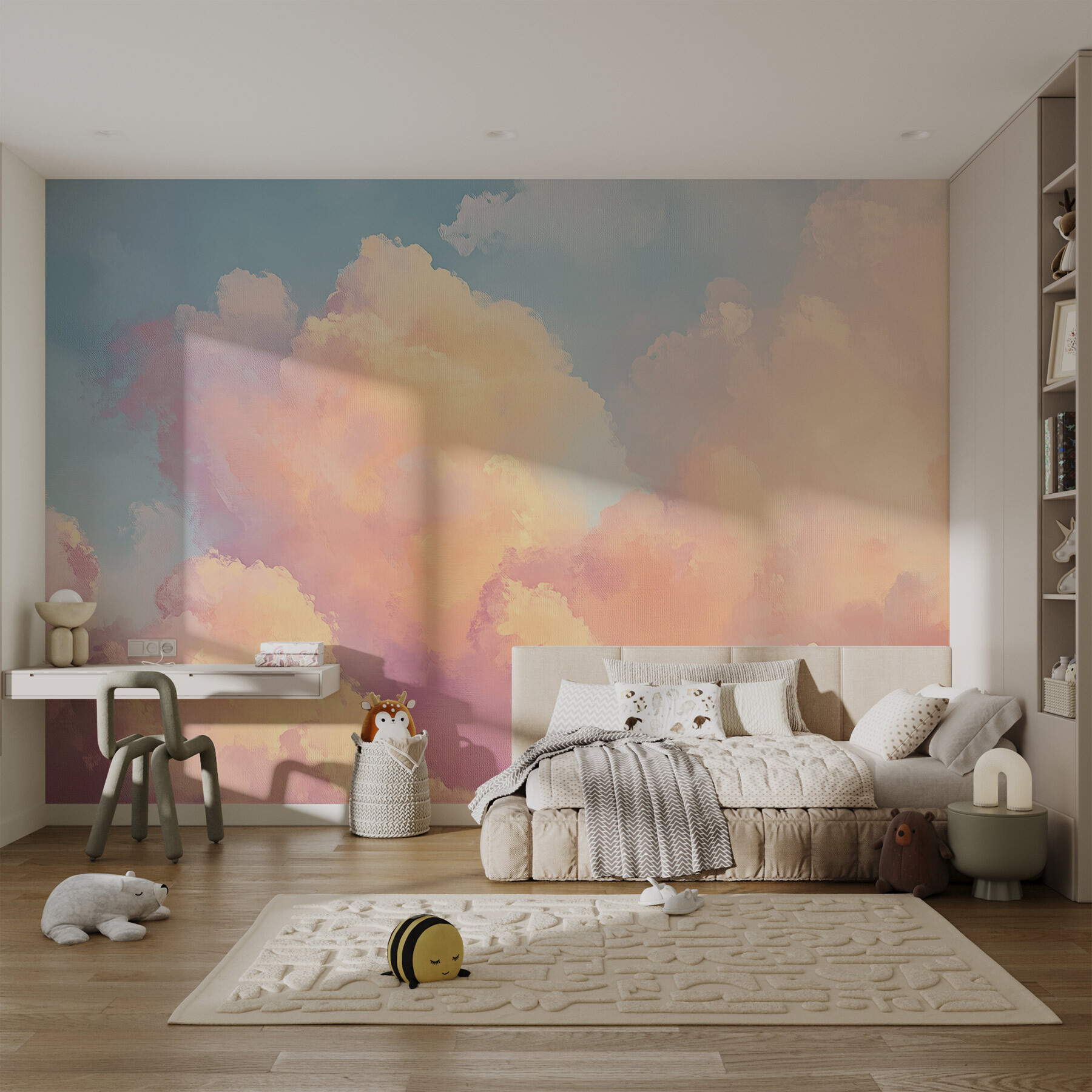 Transformați orice cameră într-o evadare de vis cu acest mural “Nori colorați pe cer”. Este ca și cum ai avea o felie de paradis chiar pe peretele tău! Imaginați-vă că vă treziți în locul ceasului deșteptător cu nori moi pastelate care vă șoptesc relaxare. Acest design superb adaugă un strop de seninătate, perfect pentru un colț de lectură confortabil sau o cameră de copil vibrantă. Împerechează-l cu un scaun confortabil și o ceașcă de ceai și vei avea norul tău personal. Fiecare privire este un memento blând pentru a pluti prin viață puțin mai ușor. De ce să nu lași pereții tăi să spună o poveste de calm și creativitate?