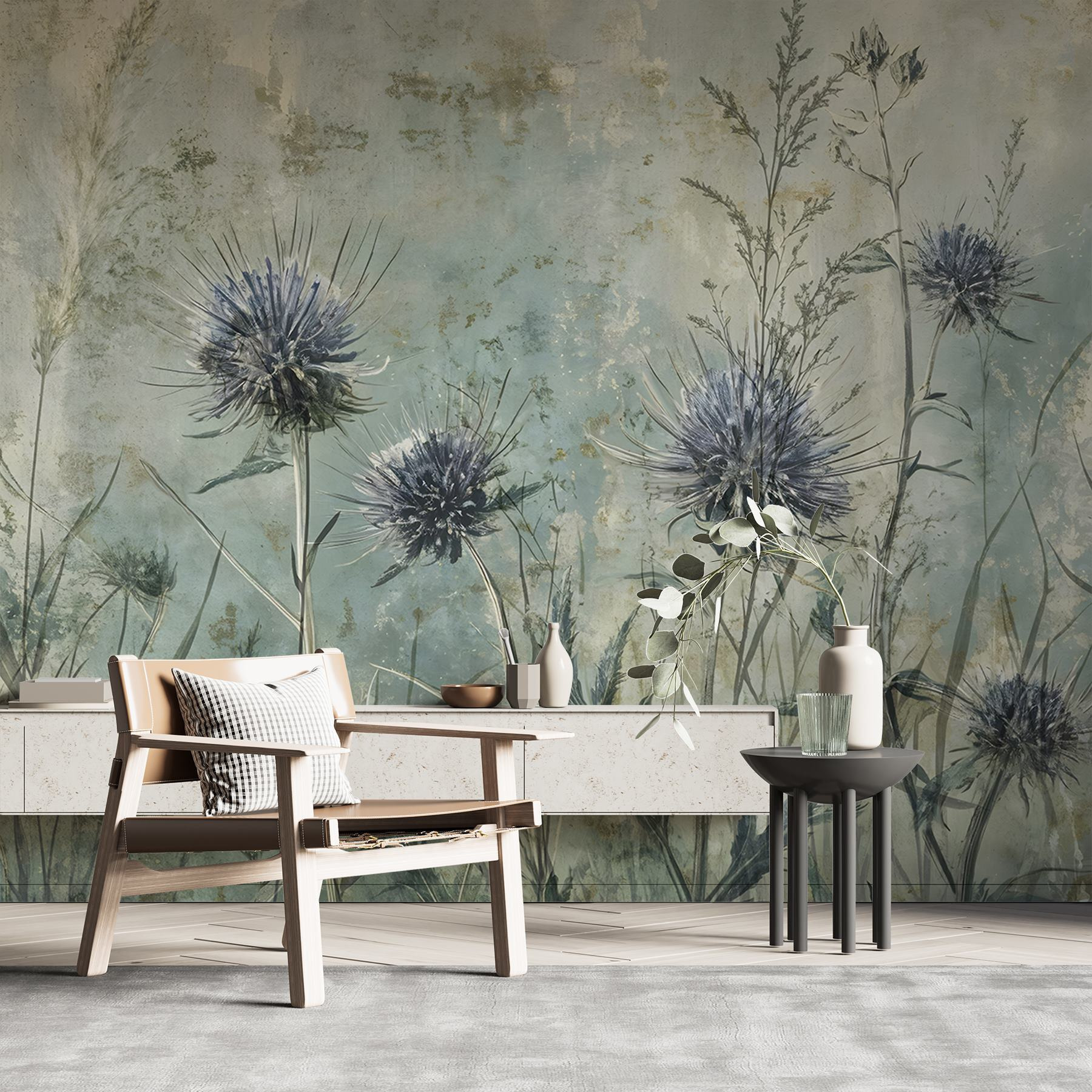 Transformați orice spațiu într-o evadare senină cu această pictură murală încântătoare de flori și plante. Imaginați-vă că vă treziți în albastrul și verdele blând, unde ierburile înalte se leagănă și florile vibrante invită la un zâmbet. Perfect pentru cei care iubesc natura, este ca și cum ai avea o grădină liniștită chiar în sufragerie. Prietenii s-ar putea să intre, să se oprească și să spună: “Wow, de unde ai asta?” Aceasta stârnește conversații și atrage oamenii înăuntru. Culorile blânde aduc un sentiment de calm, făcând-o ideală pentru serile confortabile sau diminețile liniștite. Cine nu și-ar dori să vină acasă la o mică felie de natură?