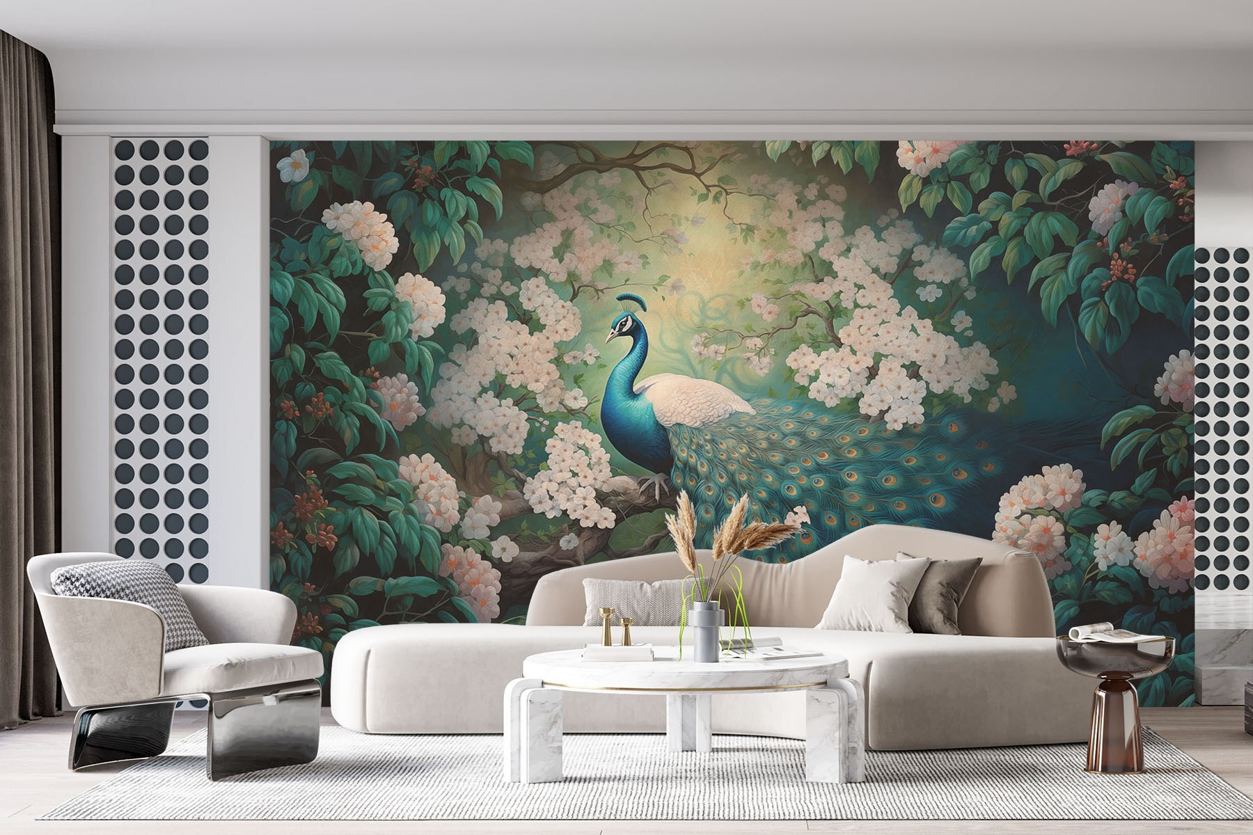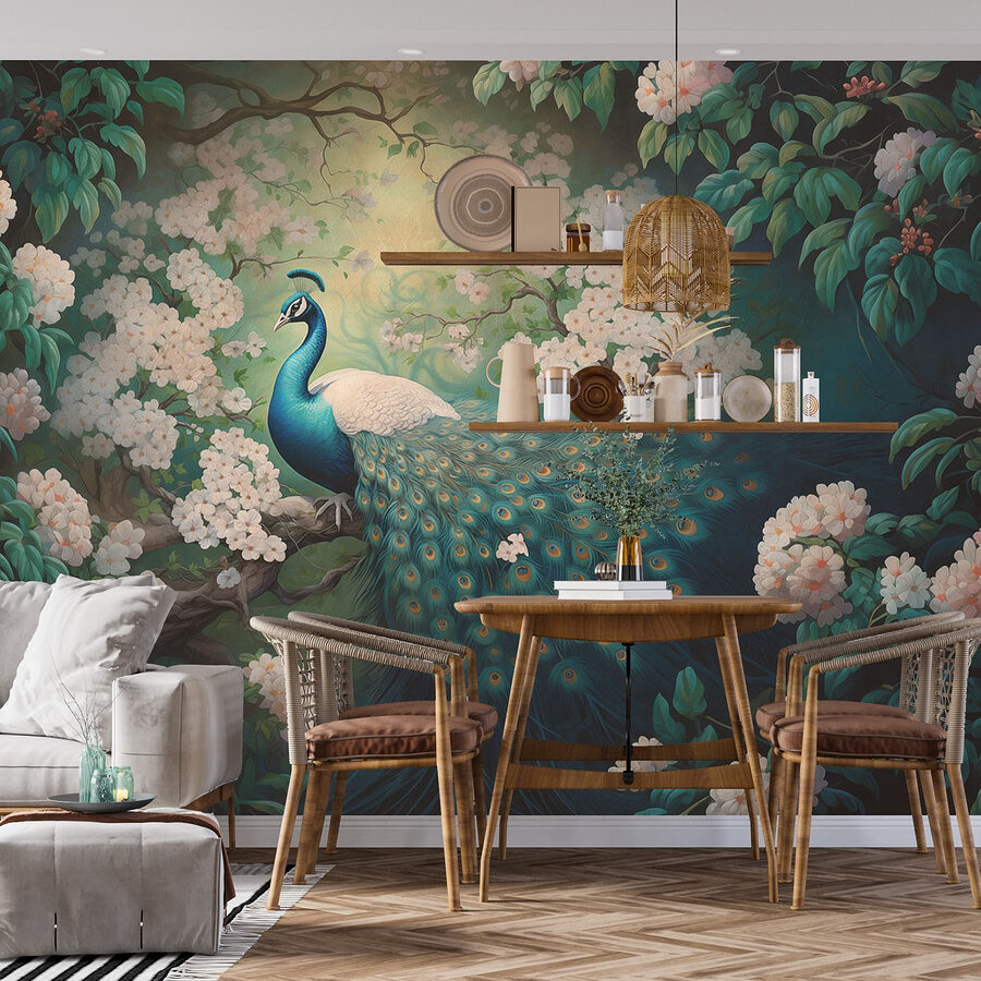 Transformați-vă spațiul cu această pictură murală uimitoare cu un păun cocoțat grațios pe o ramură de copac, înconjurat de flori delicate. Este ca și cum ai invita o bucată de natură chiar în casa ta! Imaginați-vă că vă treziți în fiecare dimineață în culori atât de vibrante – aceste albastru și verde sunt pur și simplu hipnotizante. În plus, s-ar putea să vă simțiți un pic mai elegant având o pasăre atât de maiestuoasă ca prietenă de perete.