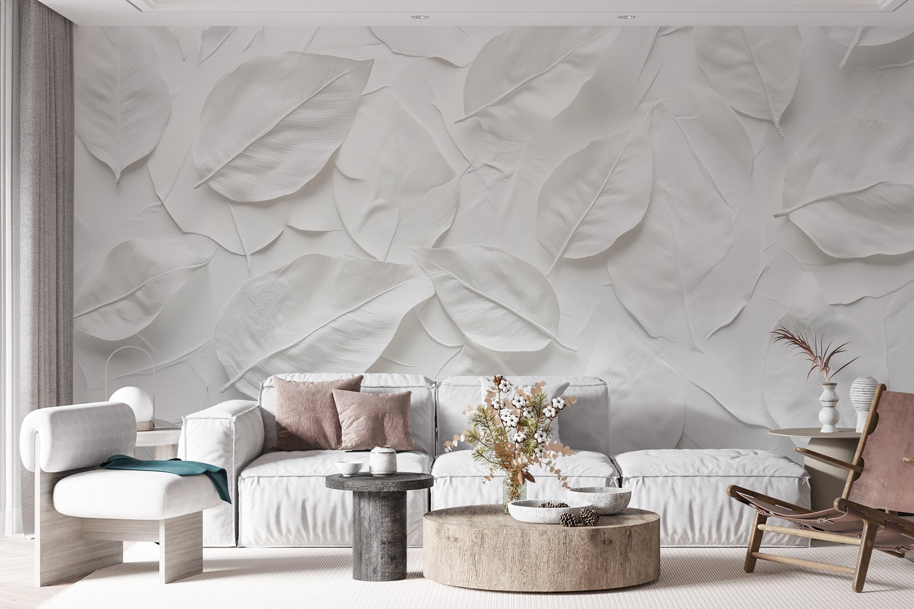 Transformați-vă spațiul cu această murală uimitoare care prezintă un aranjament minunat de frunze albe. Este ca și cum ați aduce o notă de natură în interior, fără a vă mai obosi să udați plantele. Imaginați-vă sorbindu-vă cafeaua de dimineață pe acest fundal senin, unde simplitatea întâlnește eleganța. Acest design adaugă o vibrație proaspătă, perfectă pentru cei care tânjesc după un refugiu calm chiar la ei acasă. Fie că este vorba de un living confortabil sau de un dormitor liniștit, această pictură murală pur și simplu șoptește “Relaxează-te”. Cine nu și-ar dori să se simtă un pic mai zen în fiecare zi? Este discret, dar remarcabil de încântător – la fel ca natura însăși.