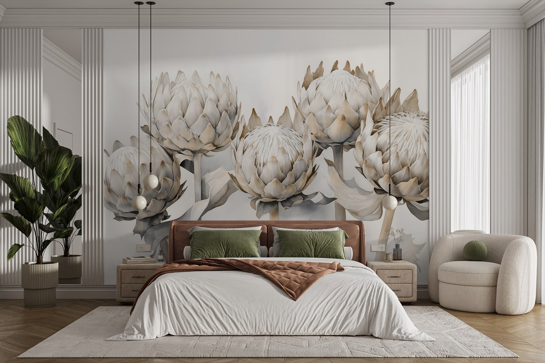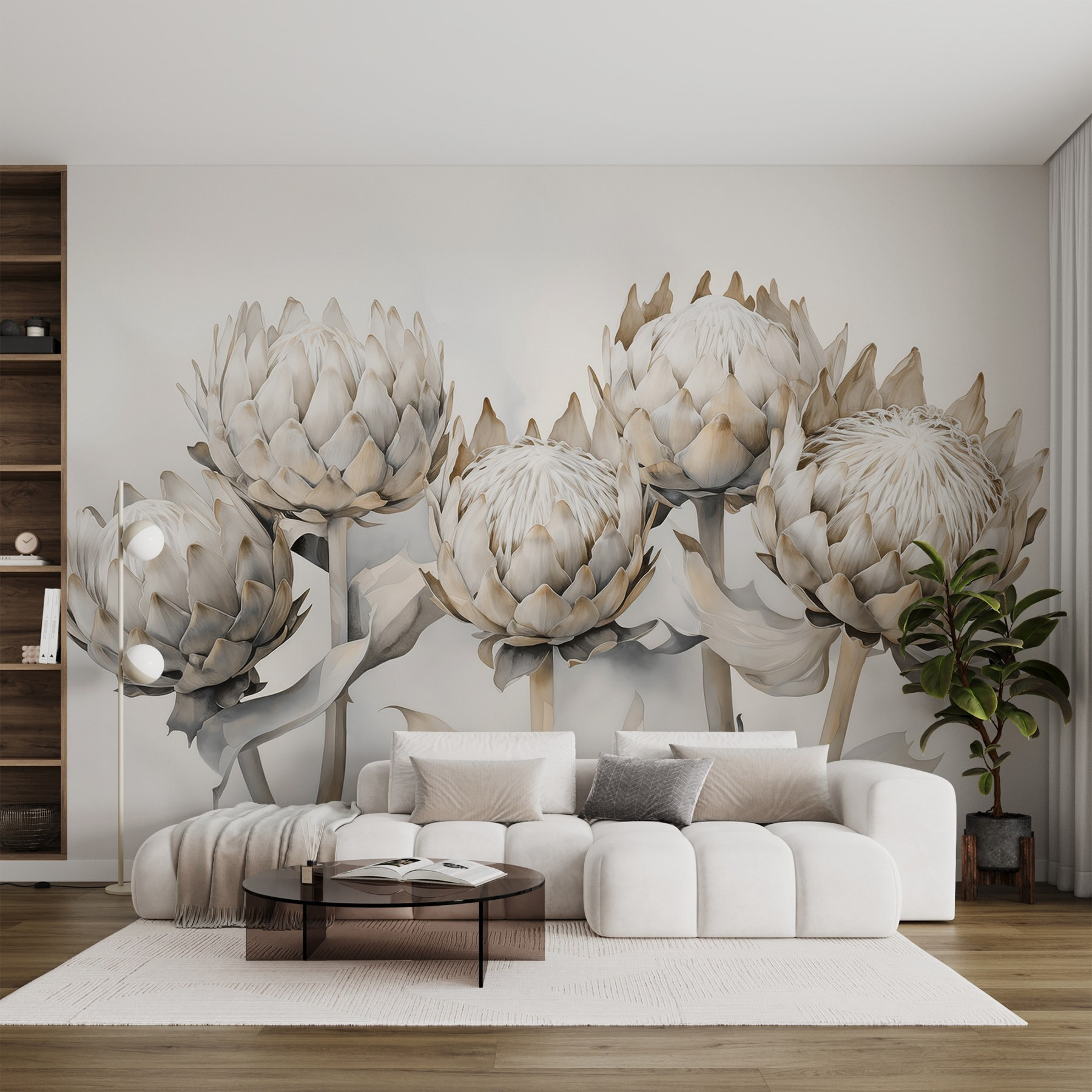 Transformarea unui spațiu cu pictura murală “Grup de anghinare cu frunze” seamănă cu aducerea unei grădini în interior, fără murdărie. Acest design uimitor surprinde frumusețea anghinarelor într-o paletă moale, subtilă, care este deopotrivă pământie și elegantă. Imaginați-vă sorbind o cafea în timp ce vă bucurați de curbele și texturile delicate care aproape se desprind de pe perete. Este ca o operă de artă a naturii, care abia așteaptă să stârnească o conversație. Perfectă pentru un colț confortabil sau o zonă de luat masa liniștită, aceasta adaugă o notă de rafinament și căldură. În plus, este o sugestie unică pentru cei care apreciază partea ciudată a florei. Cine nu și-ar dori ca anghinarea să fie decorul fermecător al casei sale?