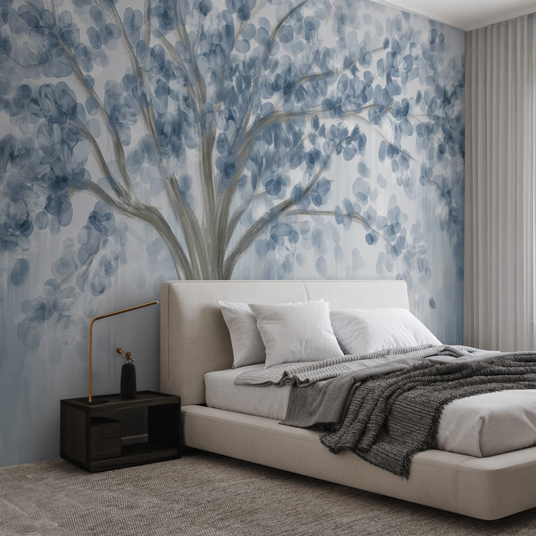 Transformați orice spațiu cu pictura murală încântătoare “Copac cu frunze albastre”. Această piesă uimitoare echilibrează albastrul aerisit și griul moale, evocând un sentiment senin, ca și cum v-ați plimba printr-o pădure liniștită. Imaginați-vă sorbind cafea în timp ce priviți aceste ramuri de vis – puteți simți mirosul de aer proaspăt? Se potrivește fără efort vibrațiilor moderne sau rustice, fiind suficient de versatil pentru un colț confortabil sau o zonă mai vibrantă. În plus, este un starter de conversație perfect, stârnind povești despre natură și aventuri. Aduceți o notă de aer liber în casă și lăsați pereții să respire!