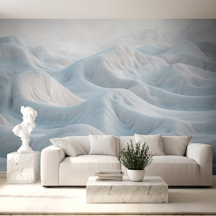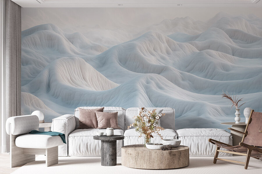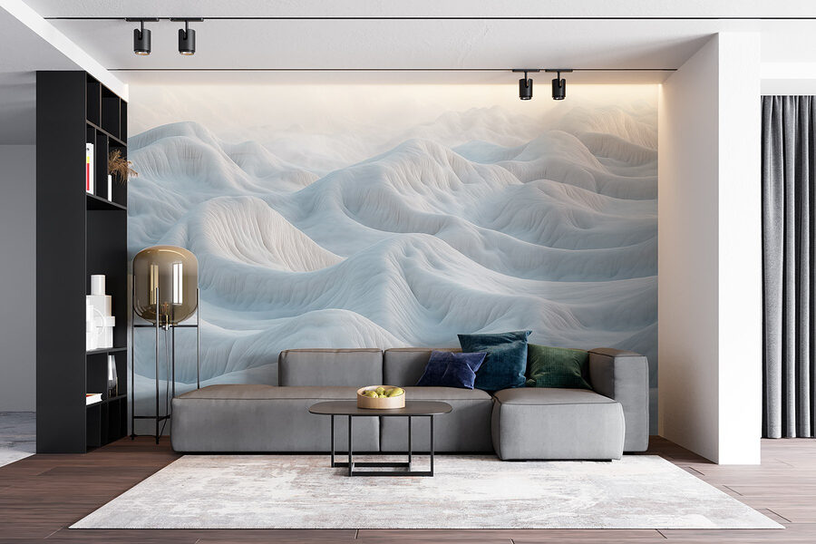 Imaginați-vă că intrați într-o cameră și, în loc de pereți simpli, sunteți întâmpinați de o pictură murală uluitoare a munților acoperiți de zăpadă. Acesta nu este doar un decor; este o invitație de a evada din agitația cotidiană. Imaginați-vă sorbind o băutură caldă, simțind cum vă cuprinde calmul senin, în timp ce curbele blânde ale terenului înzăpezit creează o atmosferă liniștită. Albul moale și texturile subtile aproape că vă șoptesc povești de iarnă. Este ca și cum ai aduce o felie de natură în interior, fără frig! Perfect pentru orice spațiu care tânjește după o atingere de liniște sau un fundal de vis. Cine nu și-ar dori asta?