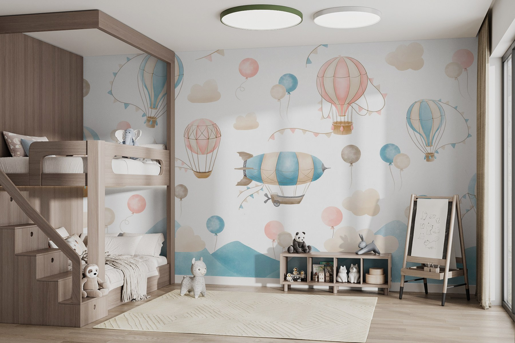 Imaginați-vă că pășiți într-o lume de vis, în care baloanele cu aer cald plutesc ușor deasupra norilor moi – sună confortabil, nu-i așa? Acest mural „Grup de baloane cu aer cald și steaguri” aduce magia aceea chiar în spațiul dvs. Vibrațiile acuarelei sunt fermecătoare, șoptind povești de aventură și zile fără griji. Imaginați-vă o cameră de copii care pare un tărâm al minunilor la înălțime sau un living care inspiră bucurie cu o notă unică. Culorile pastelate? O notă încântătoare și liniștitoare! E ca o îmbrățișare blândă de fiecare dată când o priviți. Și, hei, cui nu i-ar prinde bine puțin mai multă fantezie în viață? Perfect pentru a inspira visuri cu ochii deschiși și conversații, acest mural înfrumusețează cu adevărat orice perete. Bucurați-vă de călătorie, balon cu balon!
