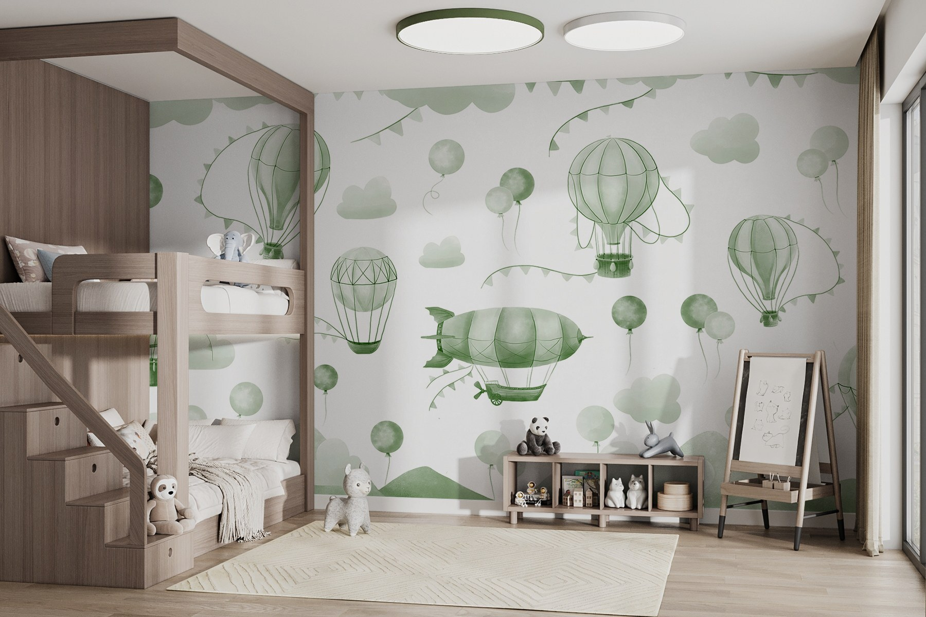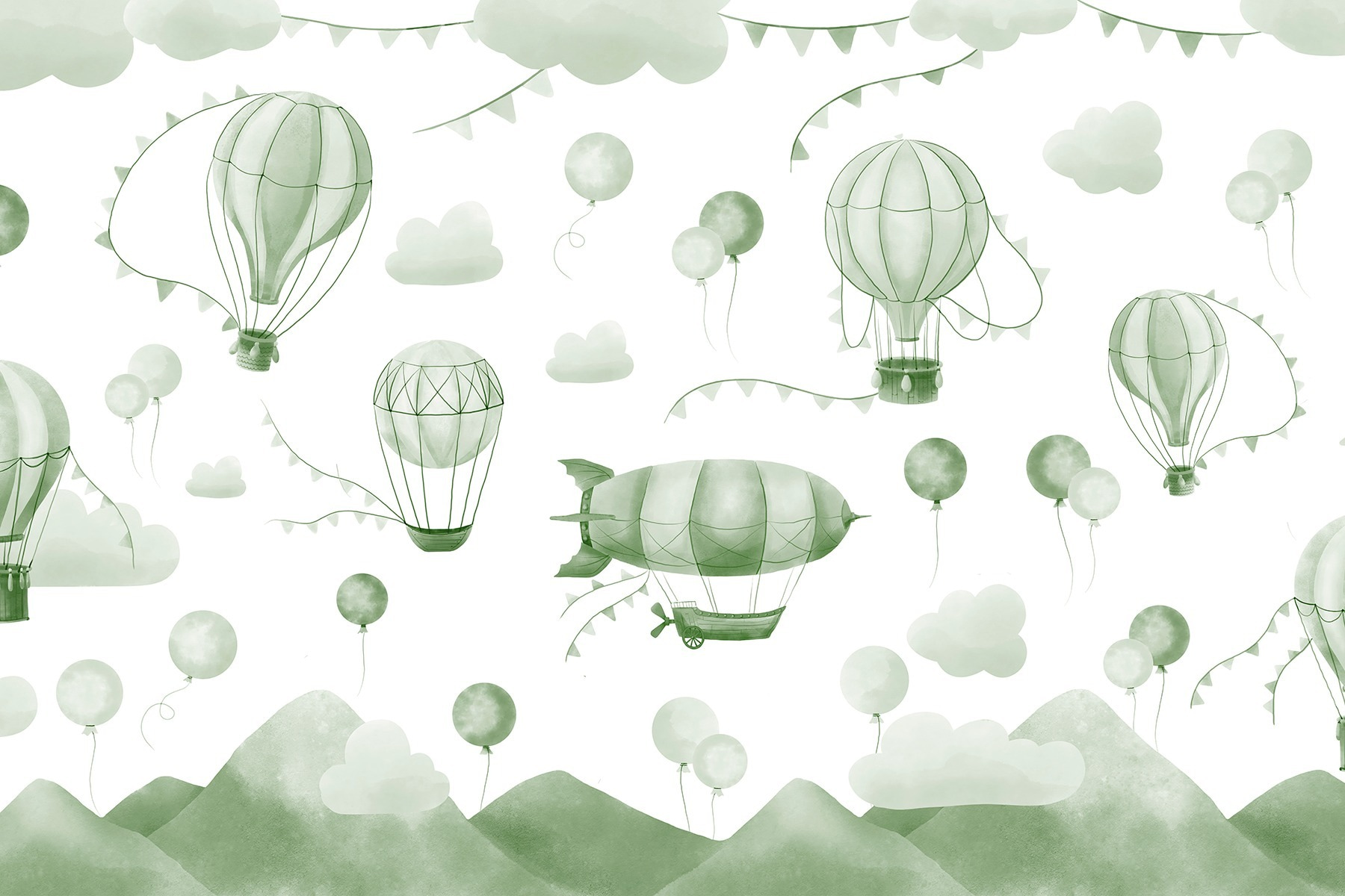 Transformați-vă spațiul cu această pictură murală încântătoare cu un amestec capricios de baloane verzi și siluete blânde de munte. Este ca și cum ați păși într-un vis sau într-o lume veselă de desene animate în care baloanele cu aer cald plutesc leneș pe cer, aducând un sentiment de mirare și aventură. Imaginați-vă o cameră confortabilă luminată de aceste nuanțe moi – o invitație la pace interioară și visare cu ochii deschiși. Este perfect pentru copii sau pentru toți cei tineri la suflet. Privirea acestor baloane care se ridică poate stârni bucurie și nostalgie, amintindu-ne de zilele însorite pline de râsete și explorare. Această pictură murală ar putea fi decorul perfect pentru o oră de povești sau doar pentru un moment de liniște la o ceașcă de ceai. Nu este doar decor; este o mică evadare fericită!