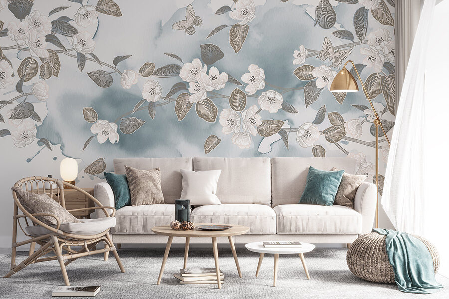 Transformați orice cameră cu această pictură murală uimitoare cu flori albe și frunze care dansează pe un fundal albastru senin. Imaginați-vă că vă treziți în fața acestei frumuseți blânde – este ca și cum primăvara s-ar fi instalat chiar pe pereții dvs. Efectul de acuarelă adaugă o vibrație moale, visătoare, care poate lumina chiar și cele mai mohorâte zile. Fie că este într-un living confortabil sau într-un dormitor calm, această pictură murală invită la pace și liniște. Perfectă pentru cei care adoră natura, dar poate uită să își ude plantele. Este o mică evadare minunată chiar la tine acasă, care face ca fiecare moment să pară un pic mai special. O atingere perfectă, nu-i așa?