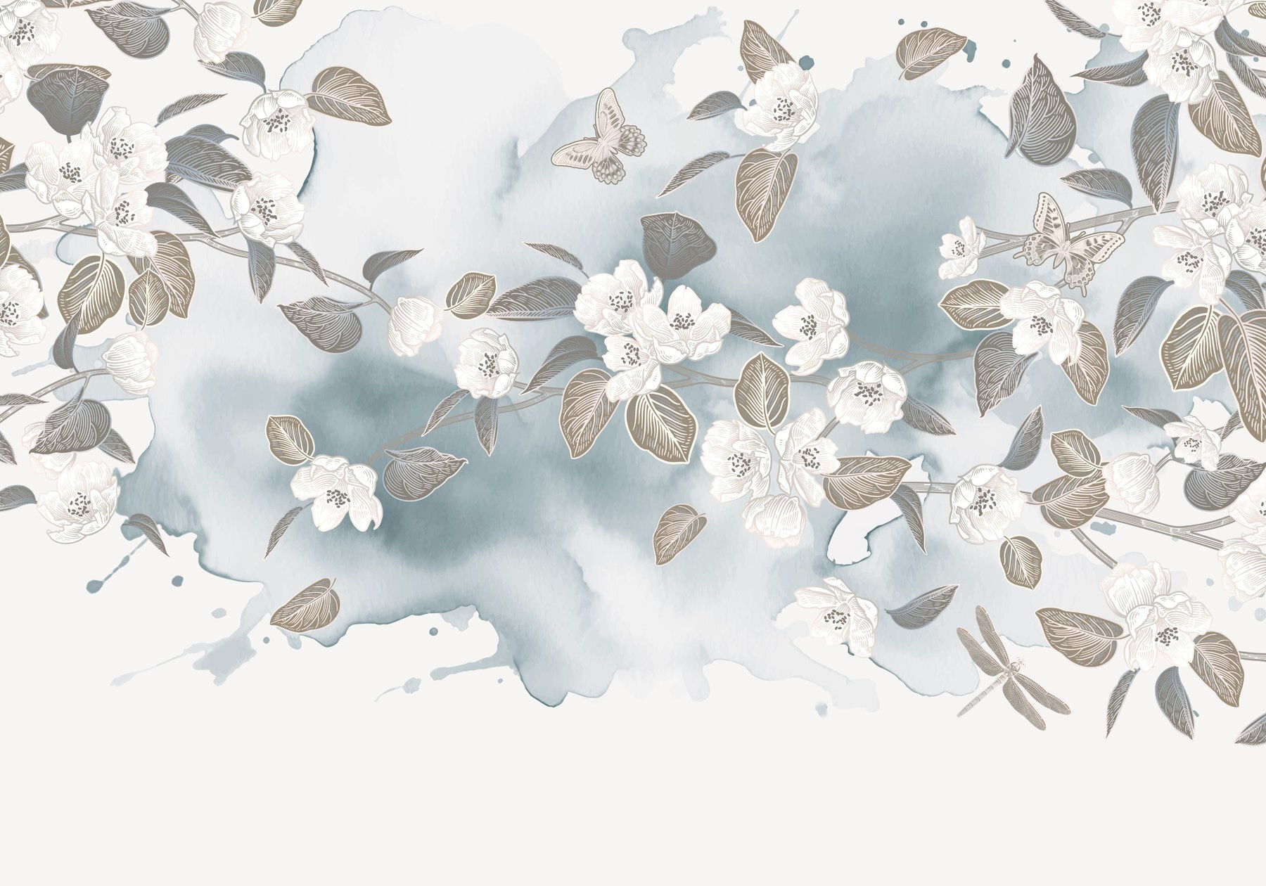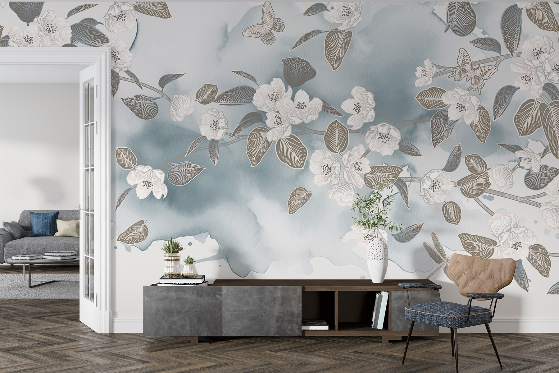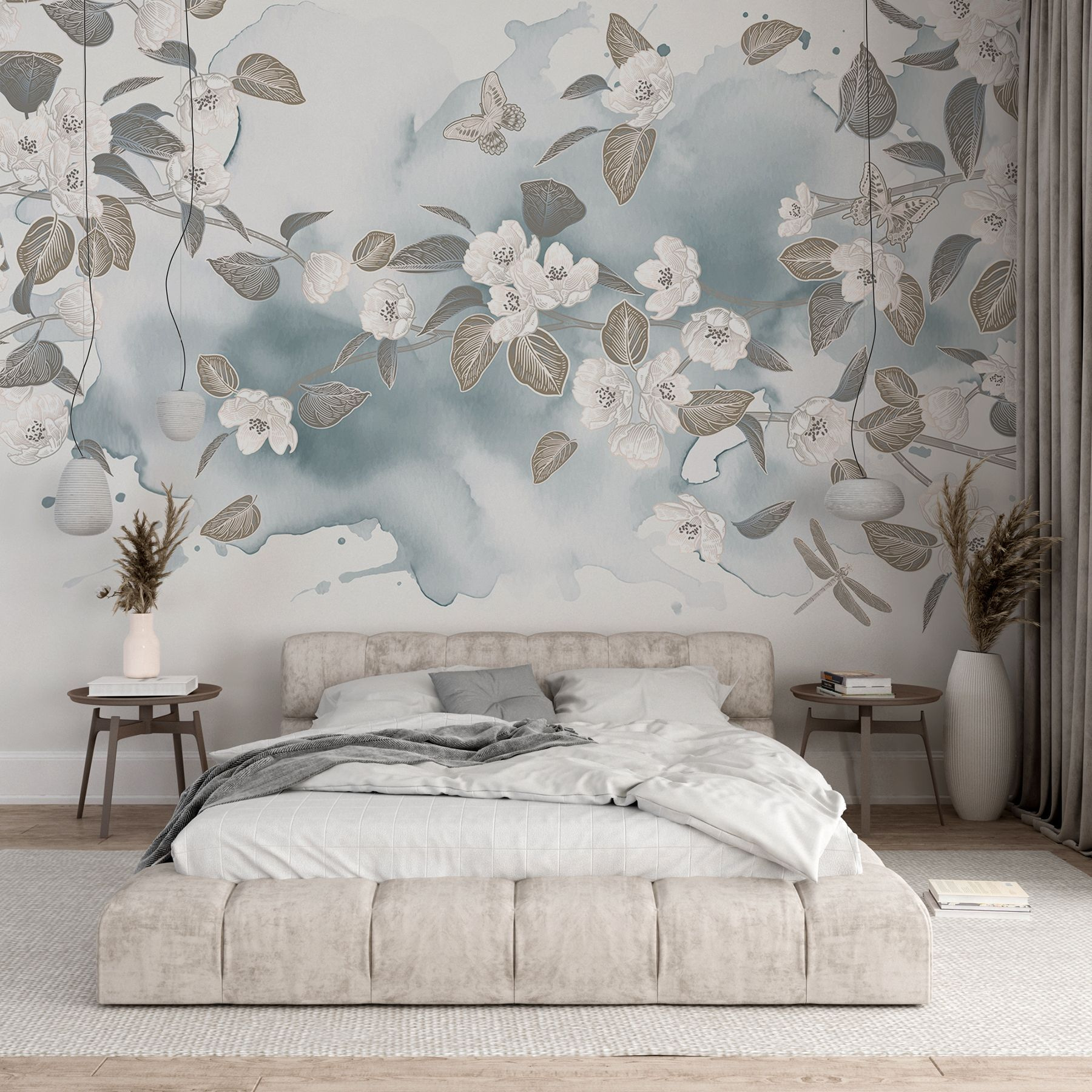 Transformați orice cameră cu această pictură murală uimitoare cu flori albe și frunze care dansează pe un fundal albastru senin. Imaginați-vă că vă treziți în fața acestei frumuseți blânde – este ca și cum primăvara s-ar fi instalat chiar pe pereții dvs. Efectul de acuarelă adaugă o vibrație moale, visătoare, care poate lumina chiar și cele mai mohorâte zile. Fie că este într-un living confortabil sau într-un dormitor calm, această pictură murală invită la pace și liniște. Perfectă pentru cei care adoră natura, dar poate uită să își ude plantele. Este o mică evadare minunată chiar la tine acasă, care face ca fiecare moment să pară un pic mai special. O atingere perfectă, nu-i așa?