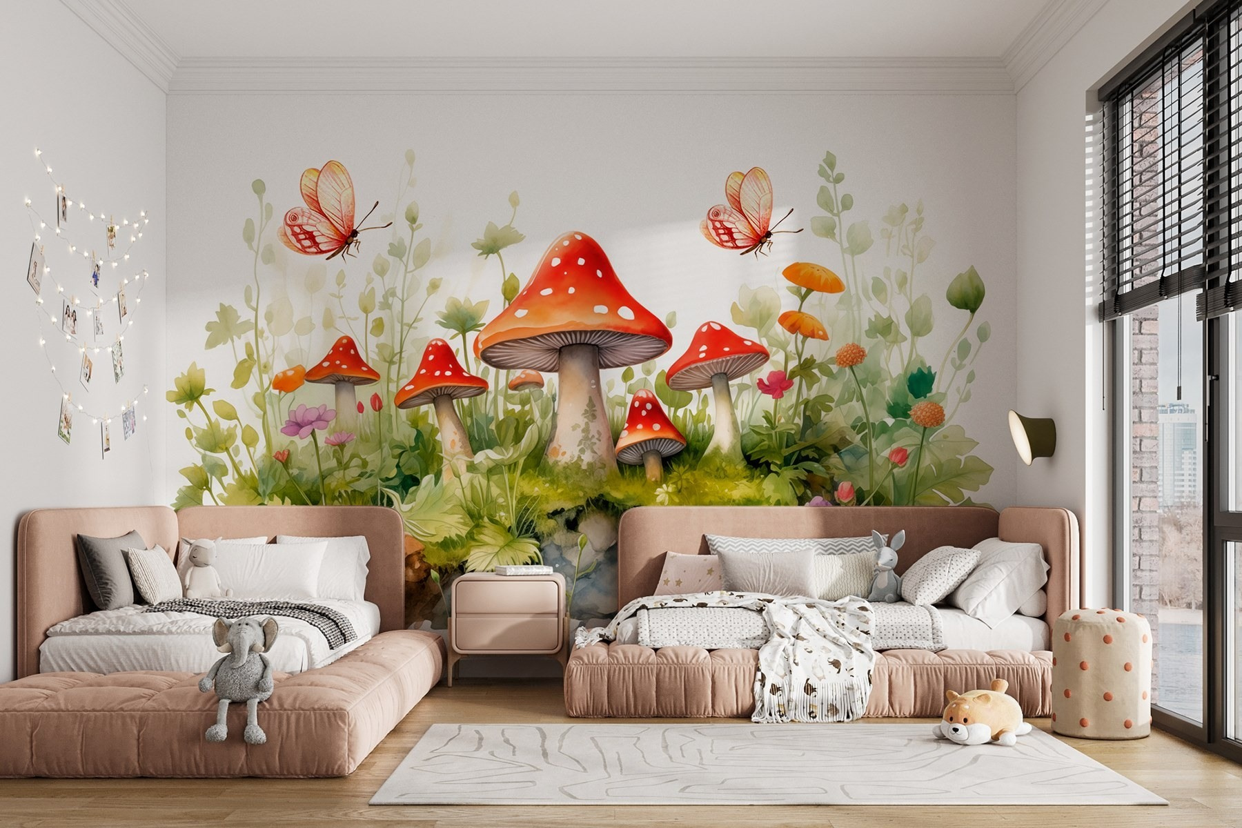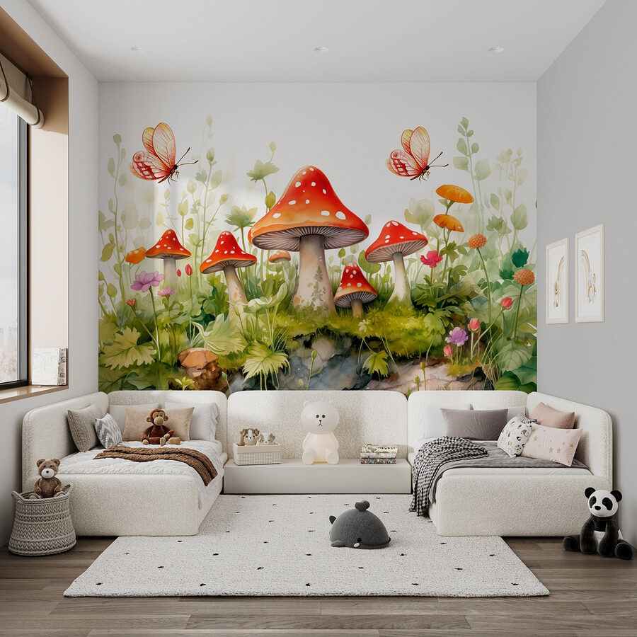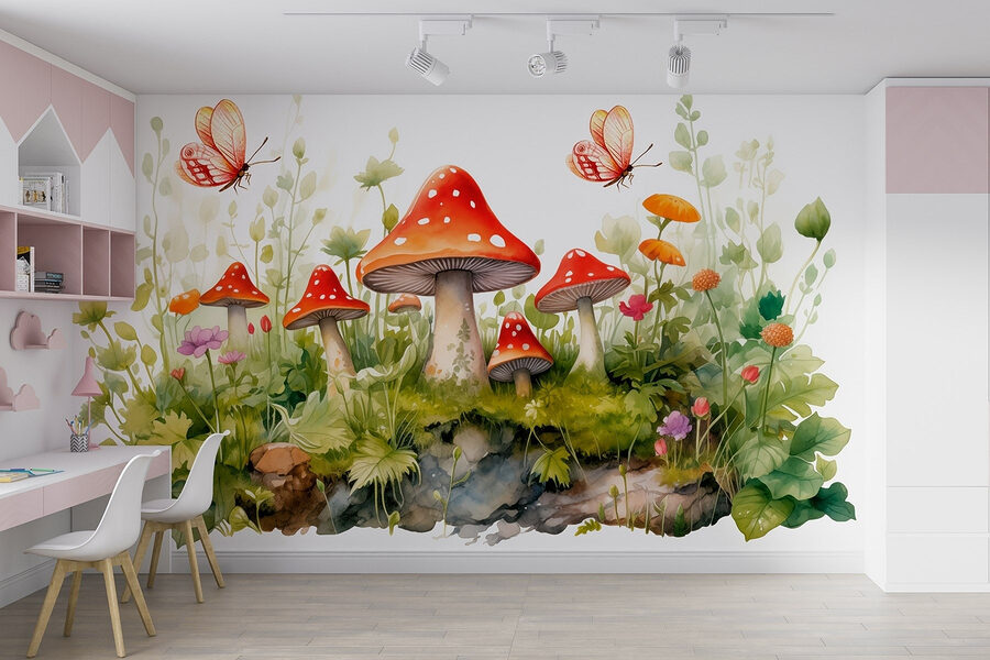 Transformați-vă spațiul cu această pictură murală încântătoare cu ciuperci fermecătoare și fluturi delicați. Imaginați-vă că intrați într-o cameră în care capriciile naturii dansează în jurul dumneavoastră. Capacele roșii vibrante ale ciupercilor ies în evidență ca niște bomboane într-o pădure, în timp ce florile pastelate își fac apariția prin vegetația luxuriantă. Acei fluturi? Magie pură, zburând pe scenă de parcă ar avea un loc special unde să fie. Este ca și cum ai aduce o felie de basm în casa ta, invitându-te să te oprești și să apreciezi micile minuni ale vieții. Această pictură murală nu doar decorează – ci stârnește bucurie! Perfectă pentru un colțișor confortabil, camera unui copil sau orice loc care ar avea nevoie de un strop de veselie.