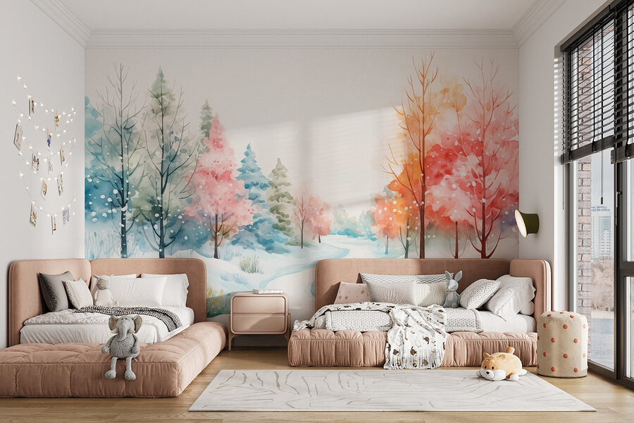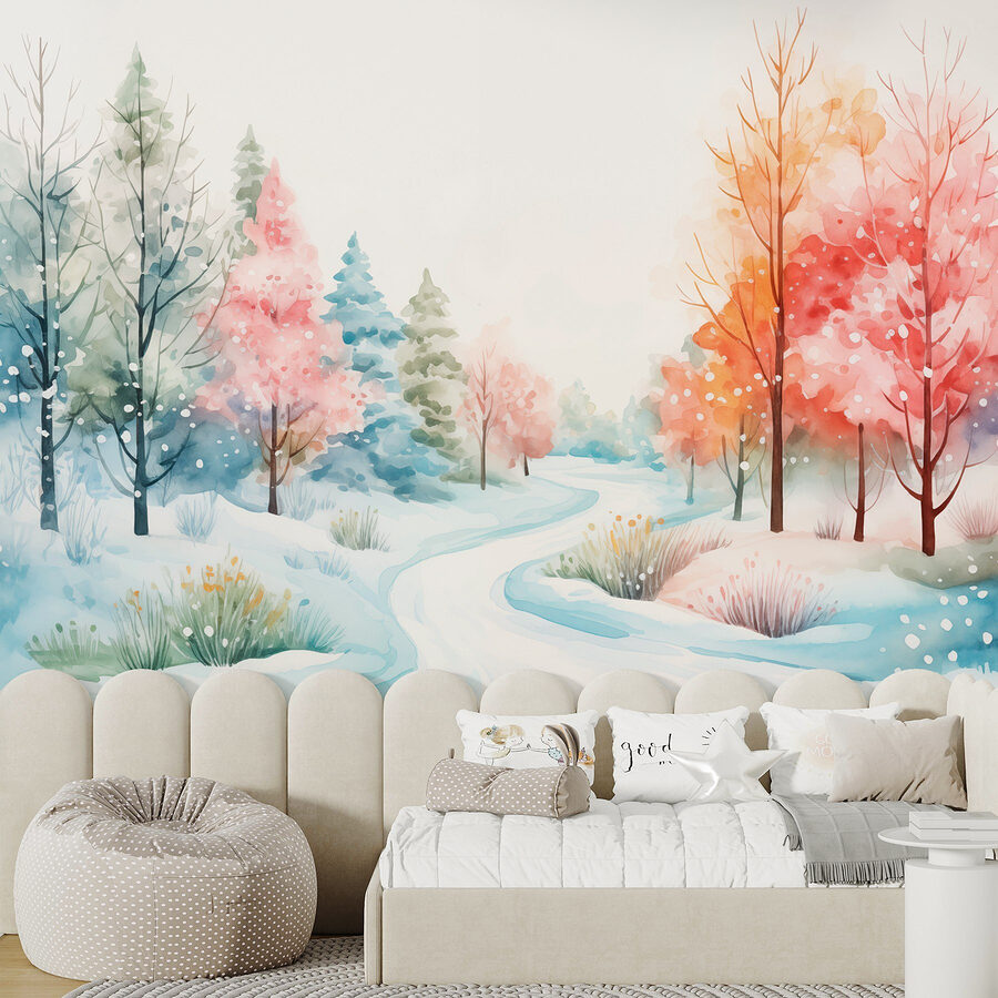 Transformați orice spațiu cu această pictură murală de vis cu o scenă în acuarelă a unui drum înzăpezit îmbrățișat de copaci. Imaginați-vă foșnetul moale al zăpezii sub picioare și foșnetul blând al ramurilor legănate de vânt. Aceasta aduce o notă de seninătate și fantezie, perfectă pentru a înveseli o cameră de zi sau pentru a lumina un birou. Punctele jucăușe de culoare ale copacilor invită căldura chiar și în cele mai înghețate dimineți. Este ca și cum ai păși într-un tărâm al minunilor de iarnă, fără degetele reci de la picioare și fără să dai zăpada cu lopata. Deci, de ce să nu vă lăsați pereții să spună o poveste de calm și frumusețe?