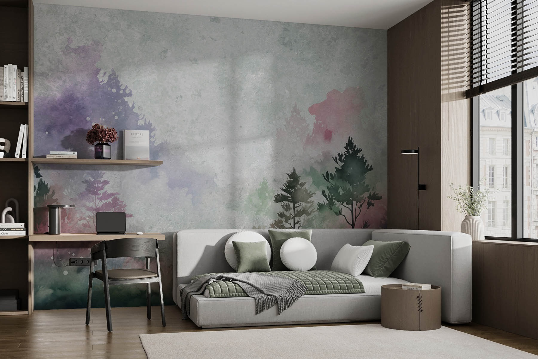 Transformați orice cameră într-o evadare senină cu această pictură murală uluitoare de copaci și plante. Imaginați-vă pășind într-o pădure liniștitoare din confortul camerei dvs. de zi, unde nuanțele blânde și tușele moi creează o atmosferă care șoptește relaxare. Imaginați-vă dimineți de duminică petrecute sorbind cafea, înconjurați de frumusețea naturii – nu sunt necesare cizme de drumeție. Vibe-ul acuarelei adaugă o notă artistică, făcându-l perfect pentru galerii sau colțuri confortabile deopotrivă. Cu adâncimile sale de vis și senzația naturală, această pictură murală invită căldura și liniștea în orice spațiu. Cine nu și-ar dori asta?