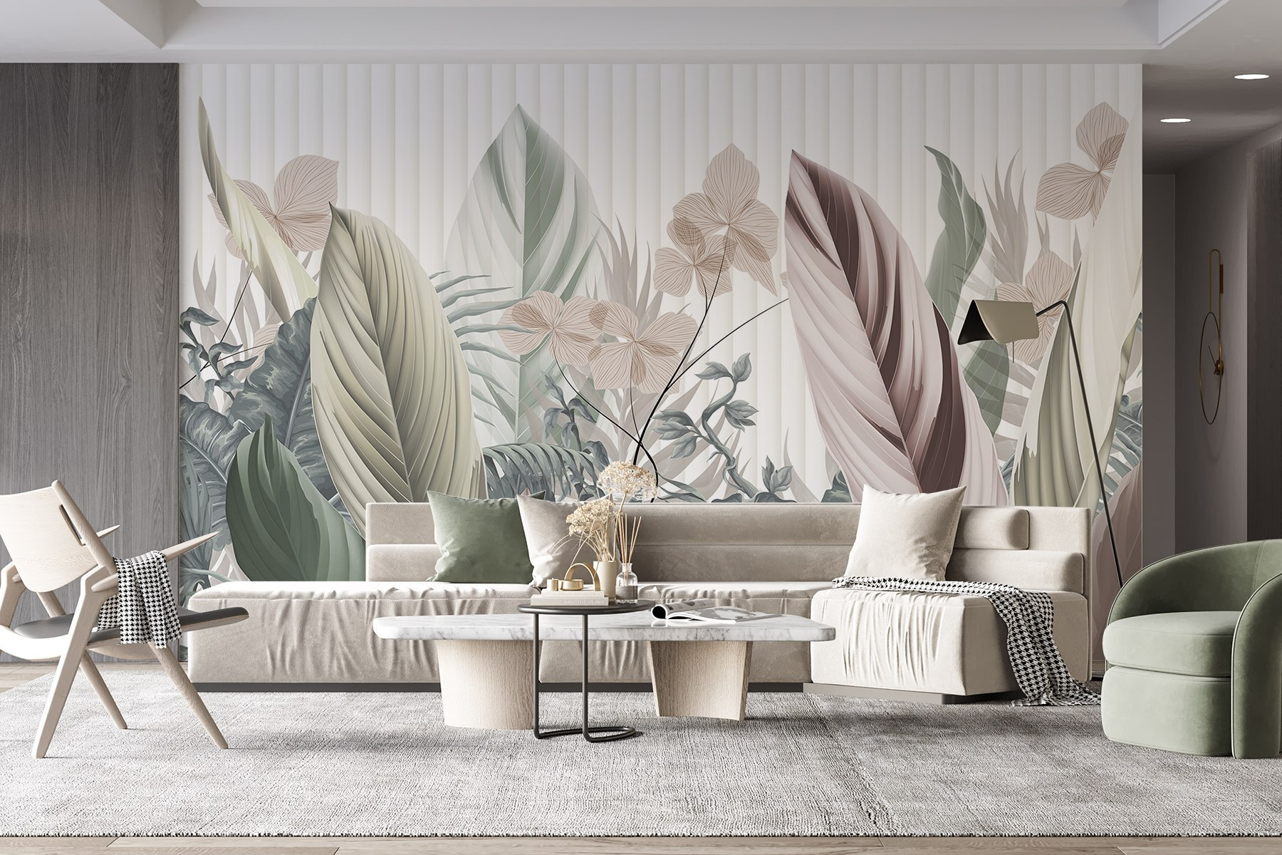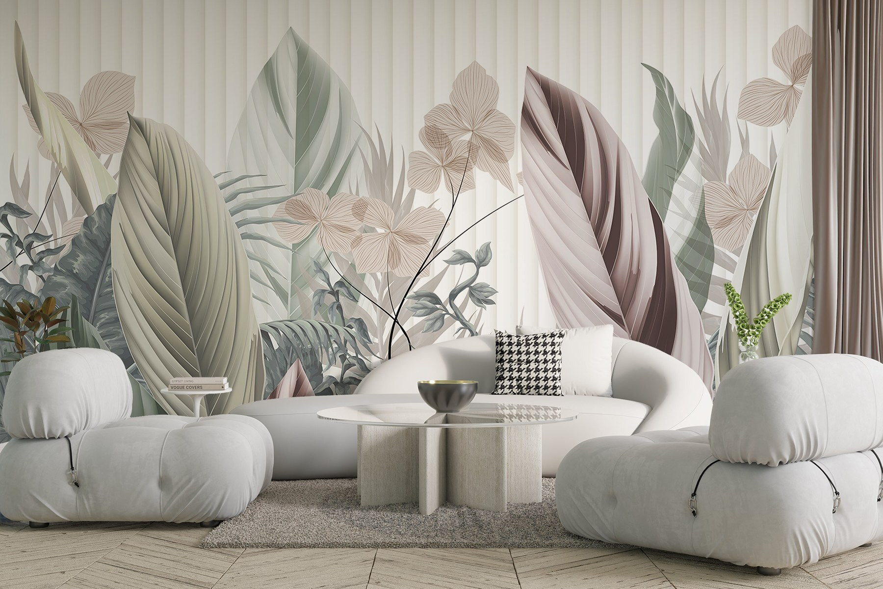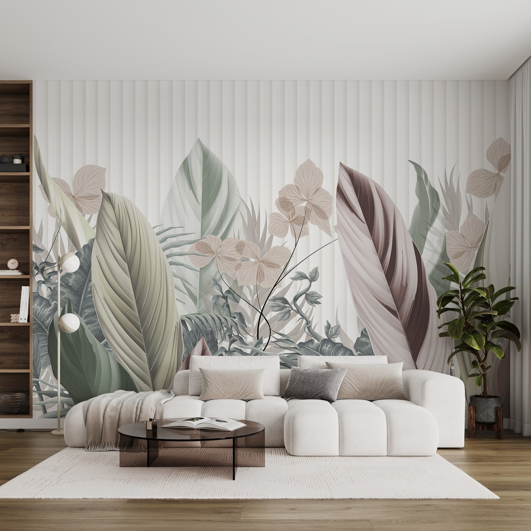 Transformați-vă spațiul cu această pictură murală încântătoare, “Eleganță naturală în tonuri stinse”. Imaginați-vă că pășiți într-o grădină senină de fiecare dată când intrați în cameră. Paleta moale de frunze și modele florale se simte ca o briză ușoară care șoptește printre copaci. Este ca și cum ai aduce marea natură în aer liber direct pe pereții tăi – nu este nevoie de degetul mare verde!