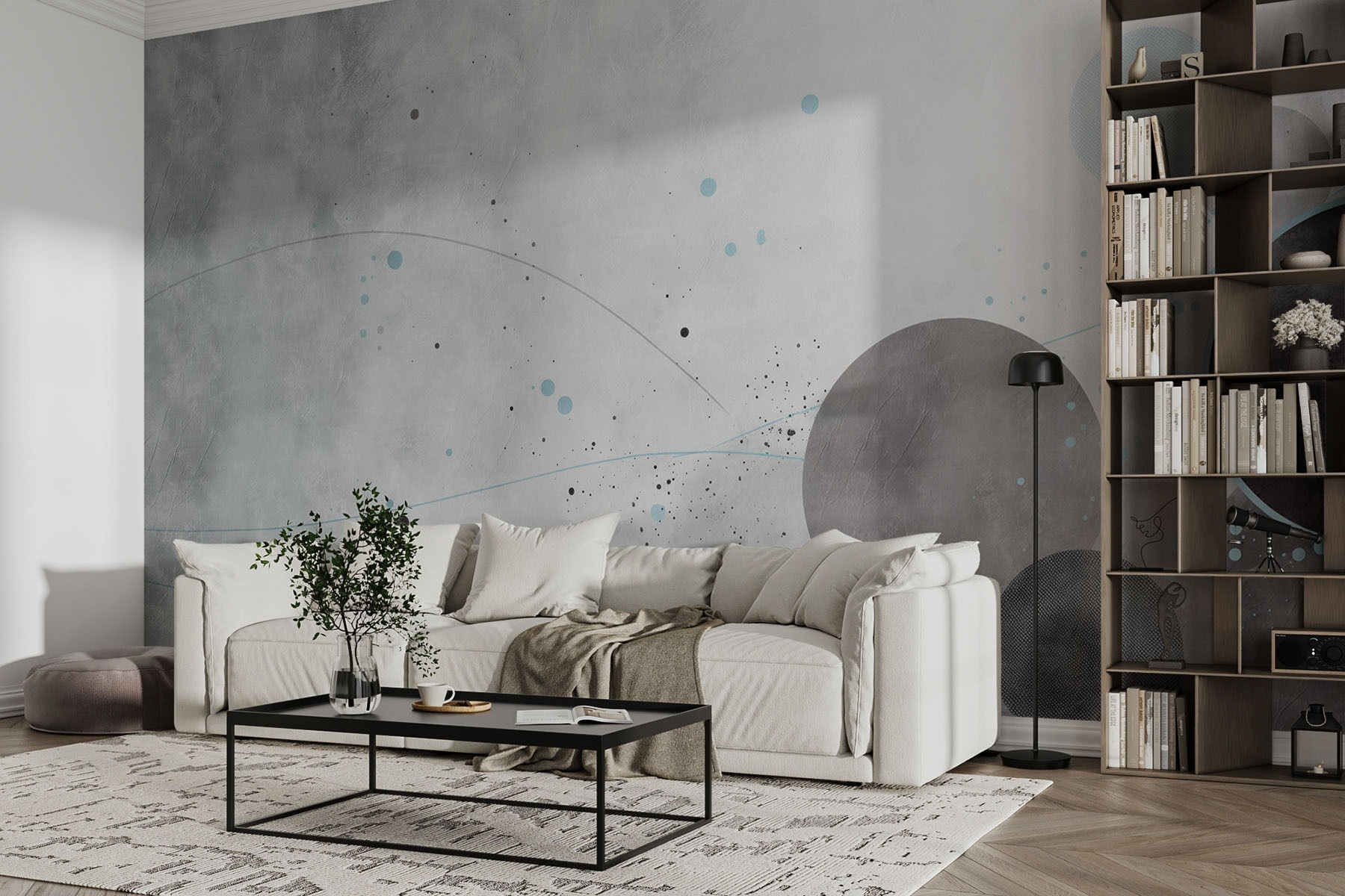 Pășiți într-o lume a vibrațiilor liniștitoare cu această pictură murală care prezintă nuanțe de gri și cercuri albastre, însoțite de linii delicate care par să danseze pe suprafață. Este ca o conversație între culori, șoptind secrete de seninătate și creativitate. Imaginați-vă sorbindu-vă cafeaua de dimineață într-un colț confortabil, cu nuanțele blânde învăluindu-vă ca o îmbrățișare caldă. Perfectă pentru o estetică modernă, această pictură murală invită la visare cu ochii deschiși și la gânduri profunde. Fie că este vorba de camera de zi sau de un spațiu creativ, aceasta dă tonul potrivit – invitant, dar vibrant și revigorant. Spuneți adio pereților plictisitori și bună ziua unui strop de inspirație!