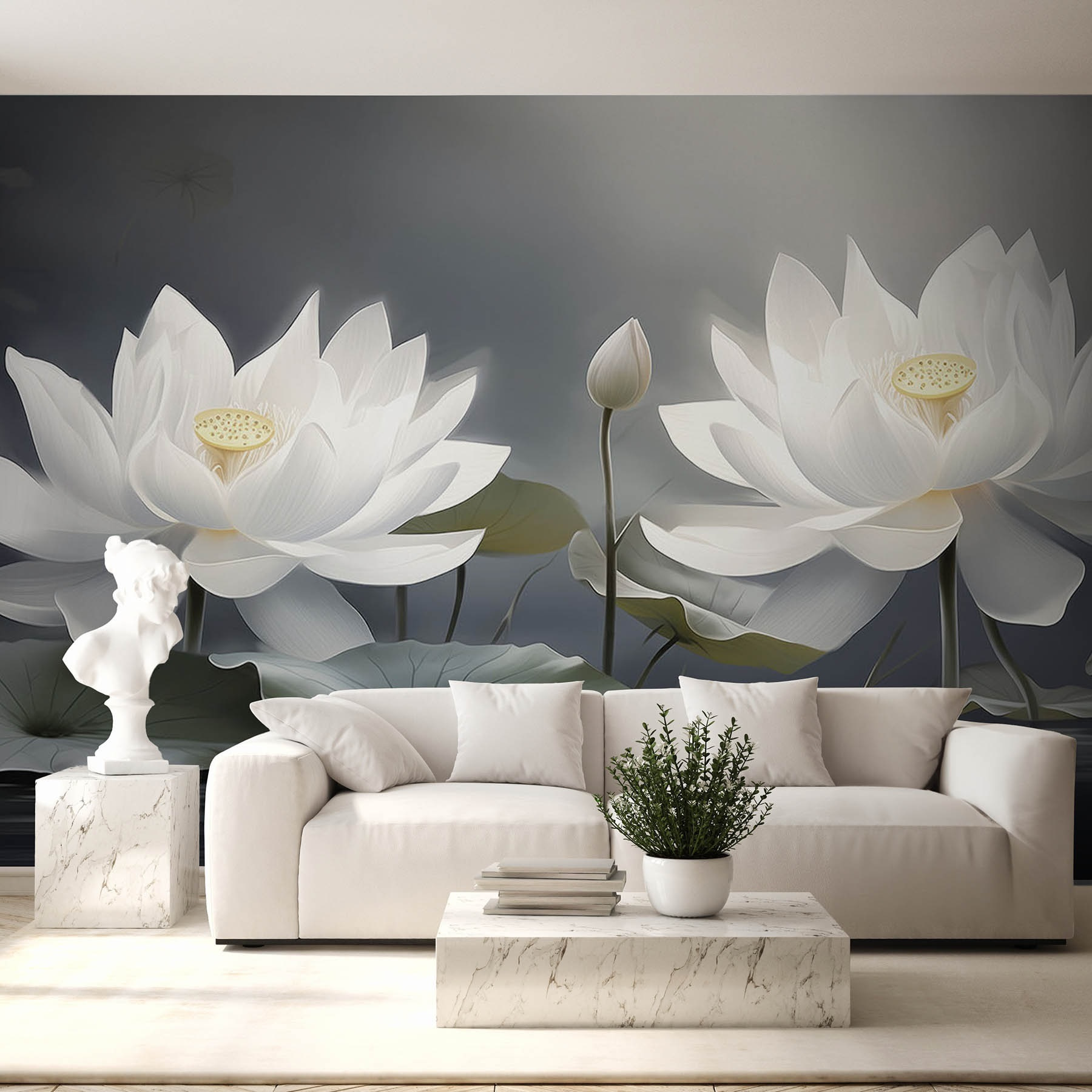 Transformați orice cameră cu această pictură murală uimitoare care prezintă un grup grațios de flori albe plutind în apă liniștită. Este ca și cum ai aduce o grădină senină chiar în spațiul tău de locuit – fără noroi și insecte, desigur. Imaginați-vă sorbind cafea în timp ce priviți aceste flori elegante, fiecare petală șoptindu-vă vibrații calme. Perfectă pentru un colț confortabil sau un dormitor de vis, aceasta adaugă o notă blândă care poate calma chiar și cele mai ocupate minți. De asemenea, stârnește conversații; așteptați-vă ca oaspeții să vă întrebe unde ați găsit o astfel de bijuterie. Decorați cu un strop din frumusețea naturii – pentru că cine nu și-ar dori flori în fiecare zi?