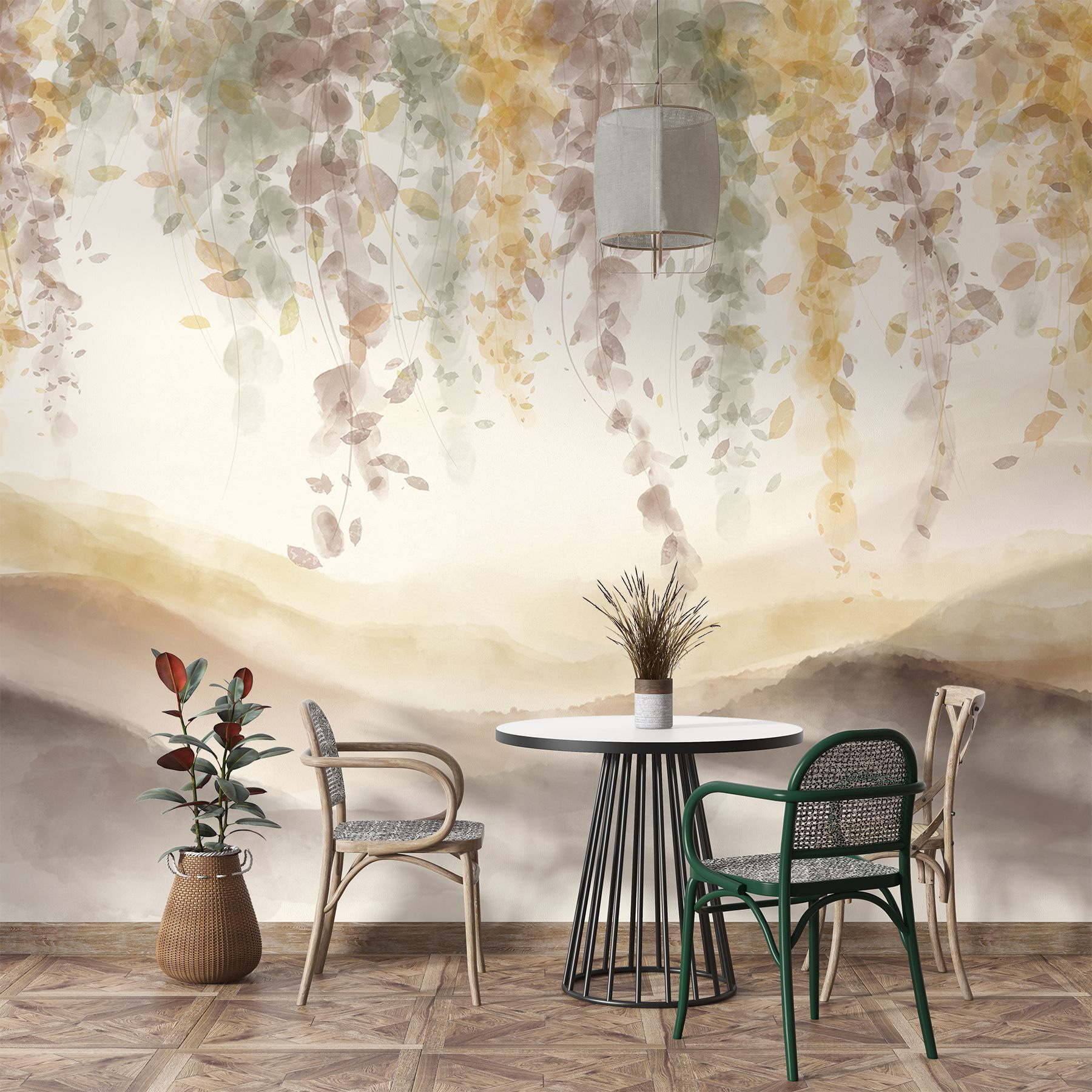 Transformați orice spațiu cu această pictură murală de vis, perfectă pentru cei care tânjesc după o notă de natură în interior. Imaginați-vă că intrați într-o cameră în care frunzele delicate par să plutească din tavan, aruncând umbre moi și invitând la un calm liniștit. Culorile atenuate evocă acea atmosferă confortabilă de toamnă, ca și cum ar fi întotdeauna acea perioadă perfectă a anului. Imaginați-vă sorbind ceai, înconjurați de frumusețea senină a acestui peisaj, simțindu-vă puțin mai liniștiți. Este ca și cum ai aduce un refugiu în aer liber chiar în casa ta – cu excepția insectelor, desigur. Perfect pentru oricine dorește să evadeze în liniște fără să iasă din casă!