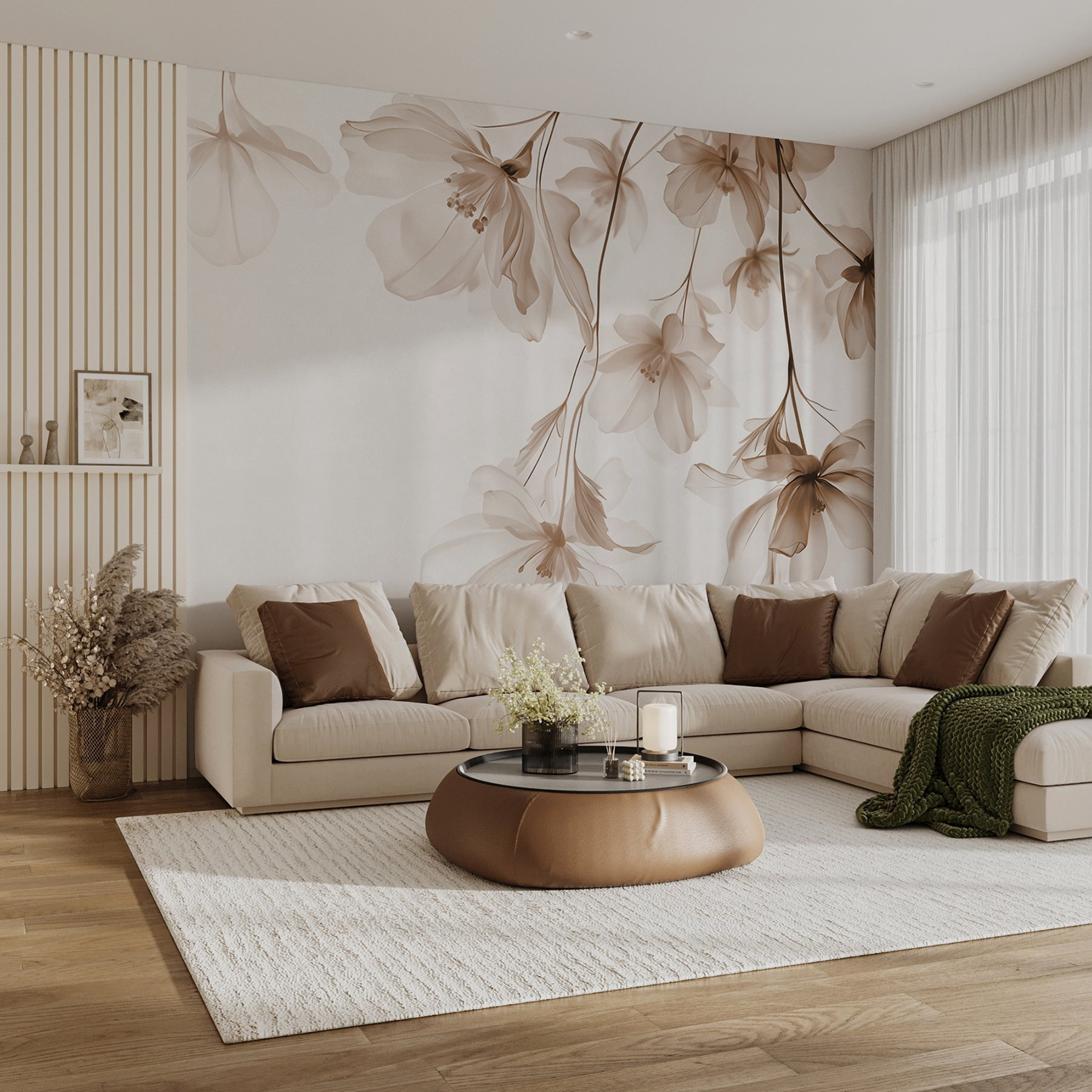 Transformați orice spațiu cu această pictură murală uimitoare cu flori delicate în nuanțe delicate. Imaginați-vă că pășiți într-o grădină senină chiar din camera dvs. de zi – fiecare floare șoptește liniște ca și cum pictura naturii a prins viață. Nu este vorba doar de decor; este o experiență. Imaginați-vă că primiți prieteni, iar conversațiile lor se estompează în fundal în timp ce admiră această priveliște minunată. Culorile blânde insuflă căldură în cameră, făcând-o să se simtă deschisă și primitoare. Perfect pentru a crea acea atmosferă de refugiu liniștit. O mică bucată de paradis, chiar pe peretele dvs.