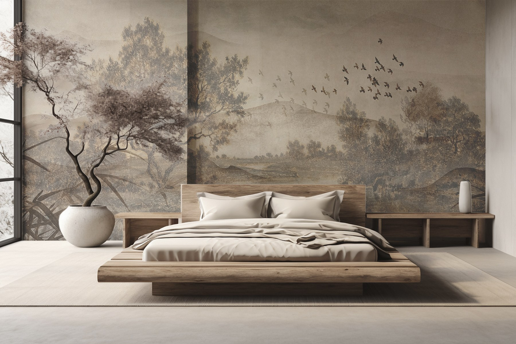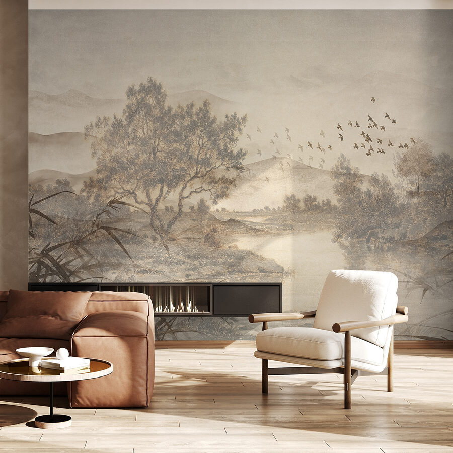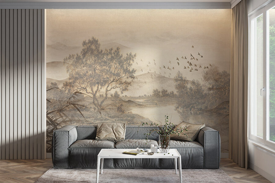 Transformați orice cameră într-o evadare senină cu această pictură murală captivantă care prezintă un peisaj liniștit cu copaci și un râu blând. Imaginați-vă că vă treziți în nuanțele blânde ale naturii – este ca și cum ați aduce o bucată de aer liber în interior. Stilul acuarelă adaugă o notă visătoare, perfectă pentru calmarea minții după o zi lungă. Imaginați-vă sorbind cafea în timp ce priviți păsările jucăușe care zboară pe lângă dvs. sau creați fundalul perfect pentru un colț de lectură confortabil. Această pictură murală vorbește despre momente liniștite și după-amieze leneșe. Nu este doar artă; este o experiență care așteaptă să vă înveselească spațiul.