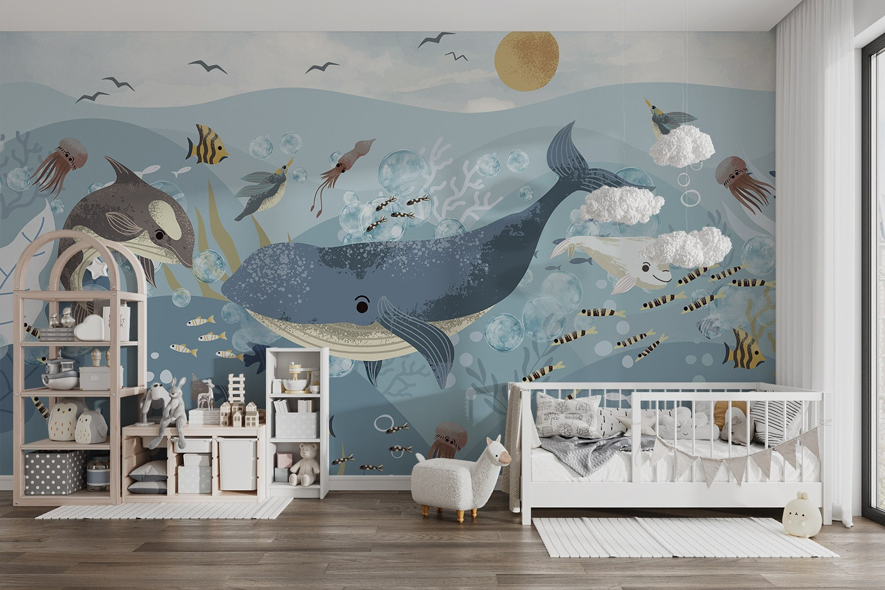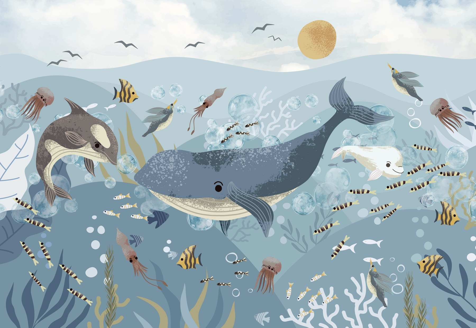 Scufundați-vă într-o lume a capriciilor cu această pictură murală care prezintă un amestec plin de viață de pești și balene care se zbenguie sub valurile blânde ale oceanului. Imaginați-vă copii chicotind, privind meduzele colorate și delfinii adorabili înotând pe lângă ei. Este ca și cum v-ați hrăni imaginația cu micul dejun cu o porție de aventură! Prietenii vor intra în cameră, simțind instantaneu briza răcoroasă a oceanului (sau cel puțin imaginându-și-o). Perfectă pentru camera unui copil sau pentru un colț de lectură confortabil, această pictură murală transformă orice perete într-un strop de fericire. Deci, dați-i drumul, lăsați această petrecere subacvatică să înveselească acele spații plictisitoare!
