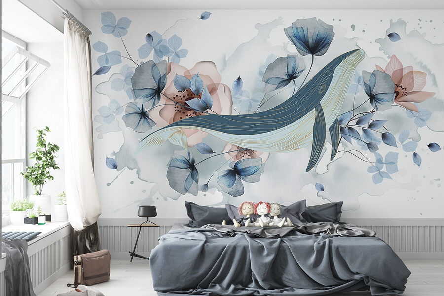 Transformați-vă spațiul cu această pictură murală încântătoare a unei balene înotând printre flori și frunze delicate. Aceasta aduce o atingere blândă a oceanului chiar în casa dvs. Imaginați-vă o după-amiază de vis petrecută relaxându-vă în colțul dvs. confortabil, în timp ce culorile pastelate moi și liniile fluide vă poartă spre seninătatea de pe malul mării. Este ca și cum oceanul șoptește secrete de aventură, încadrate de frumusețea naturii. Perfectă pentru camera unui copil, pentru un birou liniștitor sau pentru orice alt loc care ar avea nevoie de un strop de fantezie. În plus, este un mic memento că și cele mai mari creaturi se pot bucura de un vis floral cu ochii deschiși. Intrați într-o lume în care arta întâlnește liniștea!