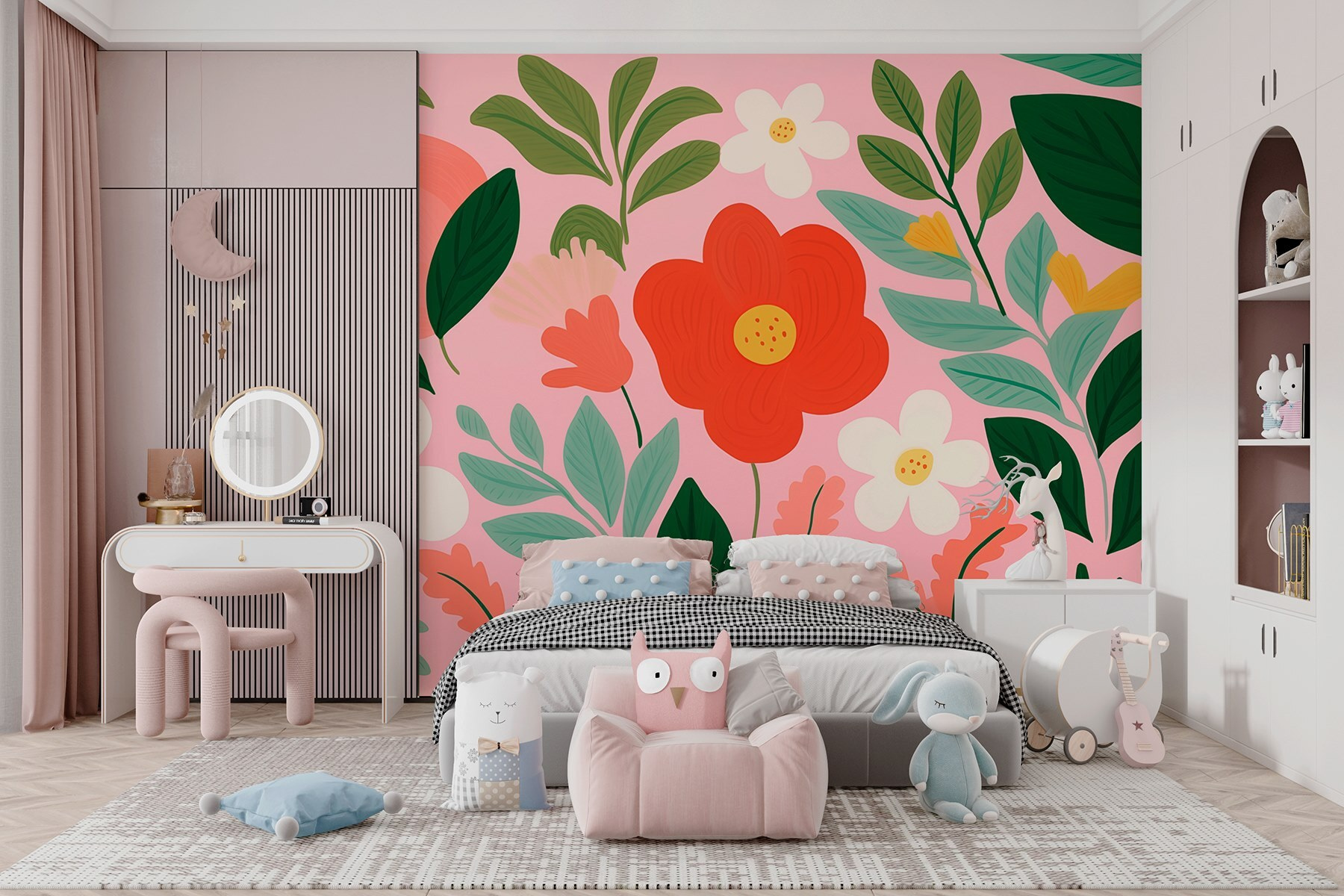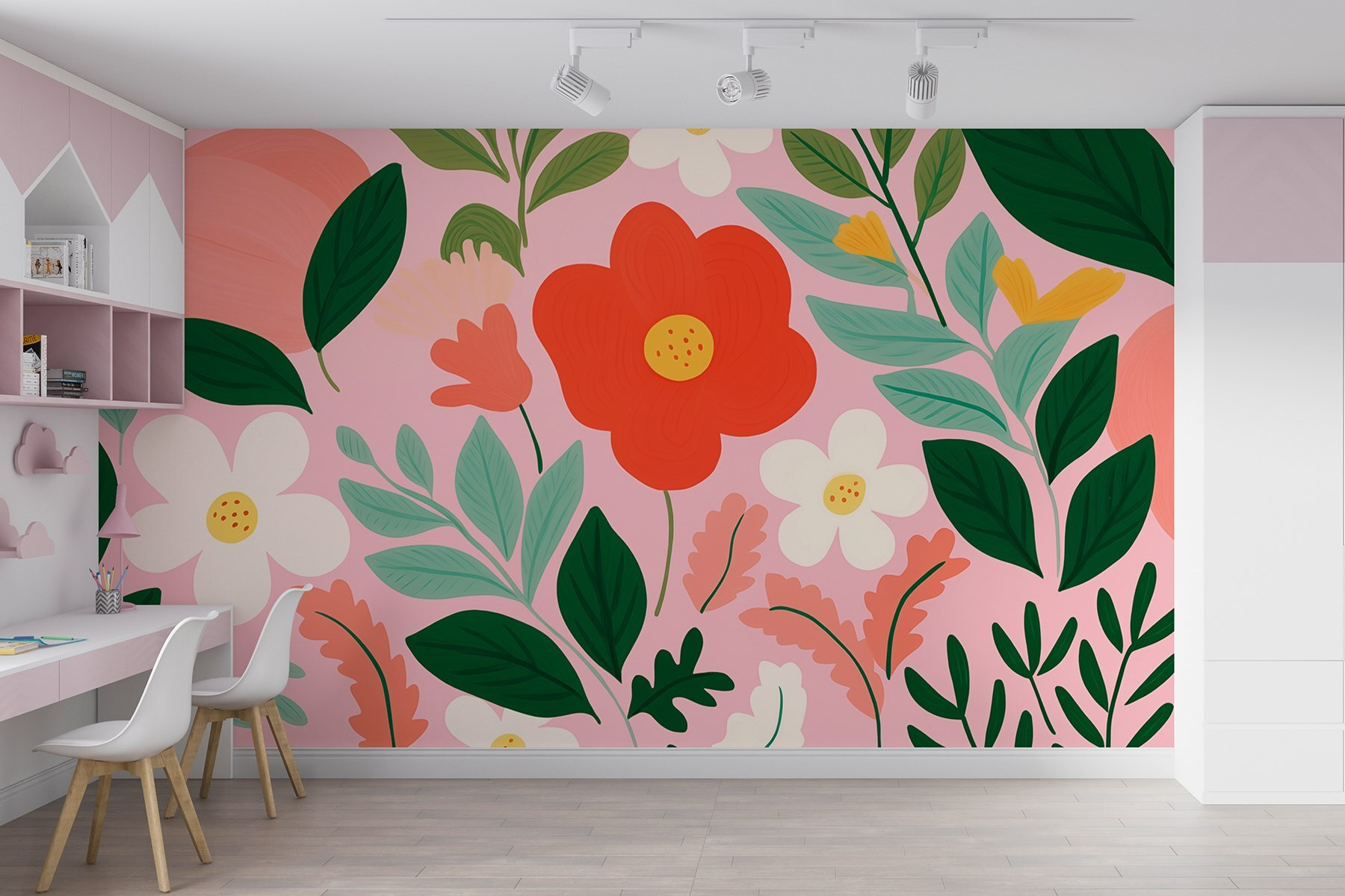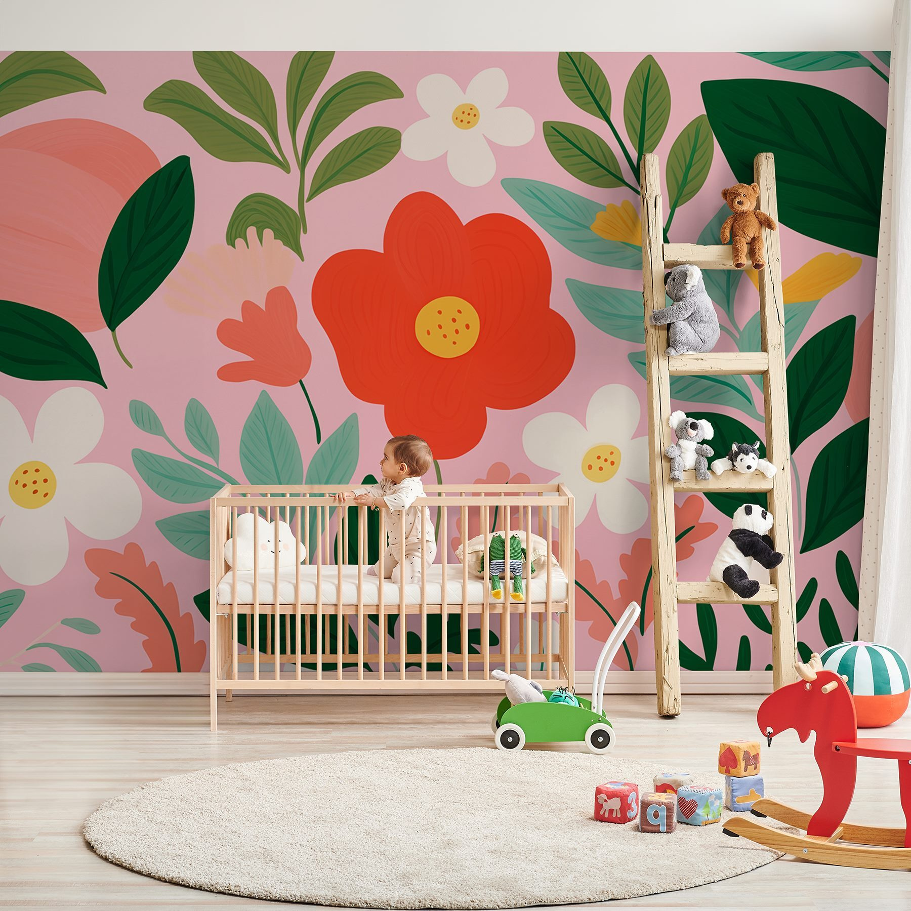 Transformați orice cameră într-un paradis înflorit cu această pictură murală plină de viață cu flori și frunze. Paleta veselă dansează cu roșu vibrant, roz moale și verde proaspăt, făcând să vă simțiți ca primăvara pe tot parcursul anului. Imaginează-ți că te relaxezi acasă, înconjurat de această explozie de natură, și dintr-o dată ești transportat într-o grădină însorită – cu flori capricioase care par să te înveselească. Perfectă pentru a înveseli o cameră de zi sau pentru a crea un colț de lectură confortabil, această pictură murală este ca o îmbrățișare din partea naturii. Imaginați-vă-o: sorbind cafea, admirând vibrațiile vesele și poate visând cu ochii deschiși la următoarea aventură în aer liber.