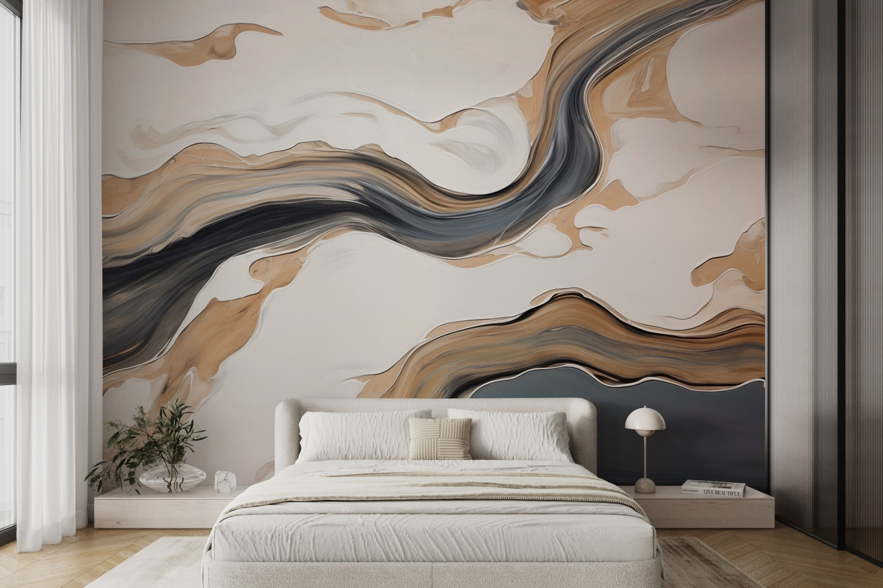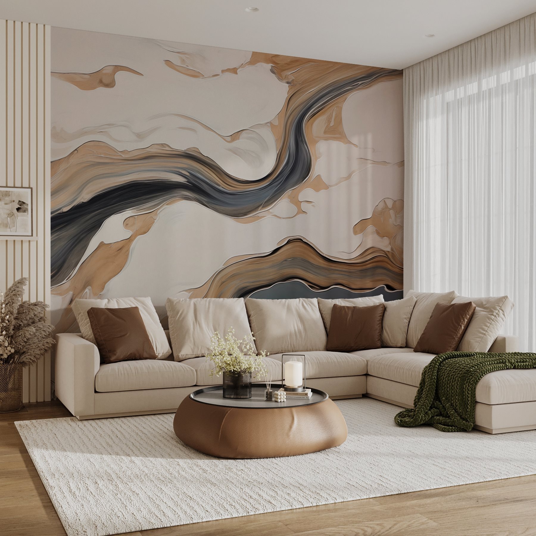 Transformați orice cameră cu această pictură murală captivantă, cu vârtejuri de negru și nuanțe moi pe un fundal luminos. Este ca și cum ați păși într-o lume abstractă de vis – într-un moment admirați opera de artă, iar în următorul vă stârnește imaginația. Imaginați-vă seri confortabile, încolăciți cu o carte, cu pereții șoptindu-vă creativitate și calm. Este ca și cum ai avea o operă de artă care invită la conversație și la mirare. Perfectă pentru cei care doresc un pic de farmec fără a copleși simțurile, această pictură murală ridică fără efort orice spațiu, făcându-l să se simtă ca acasă dulce acasă.