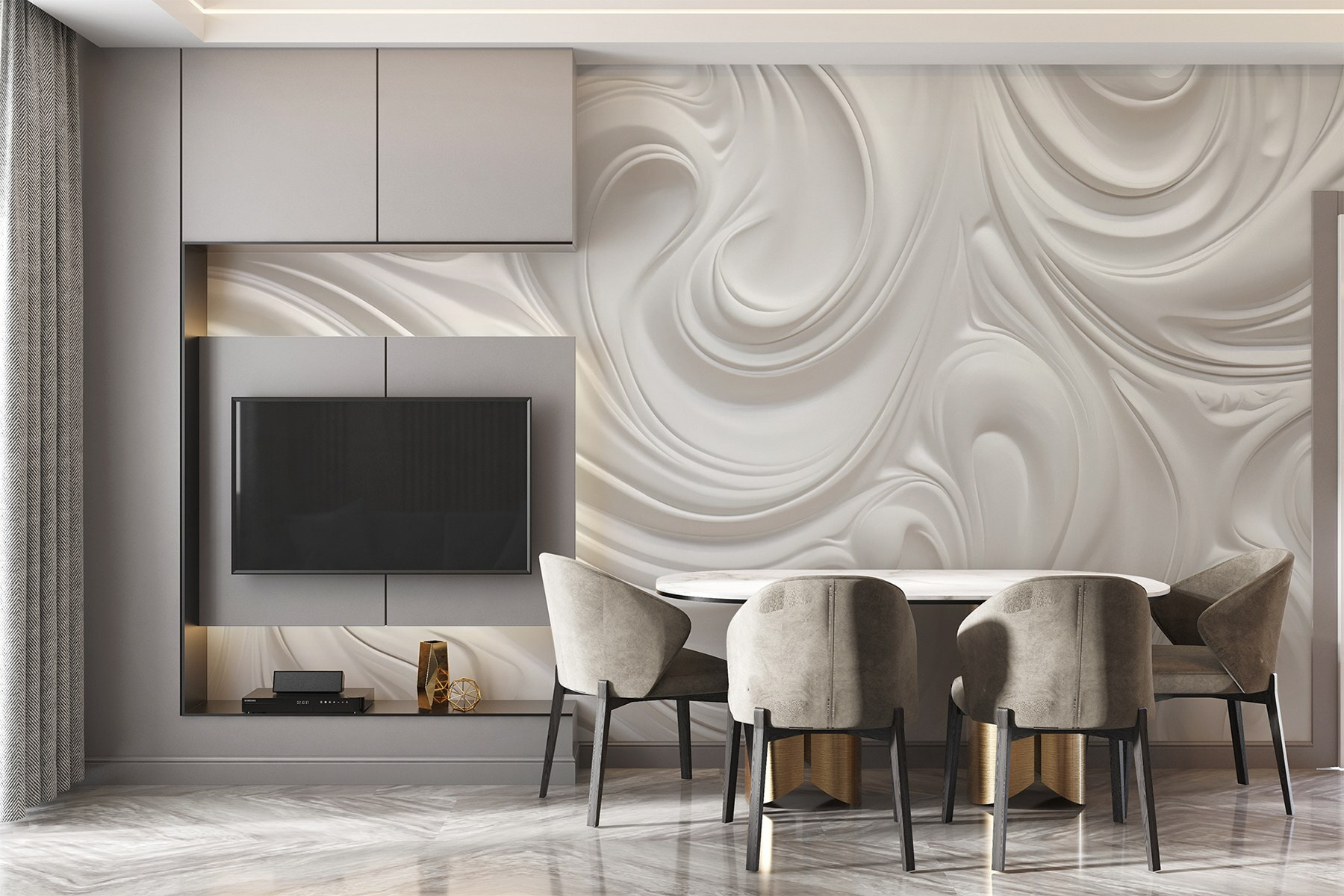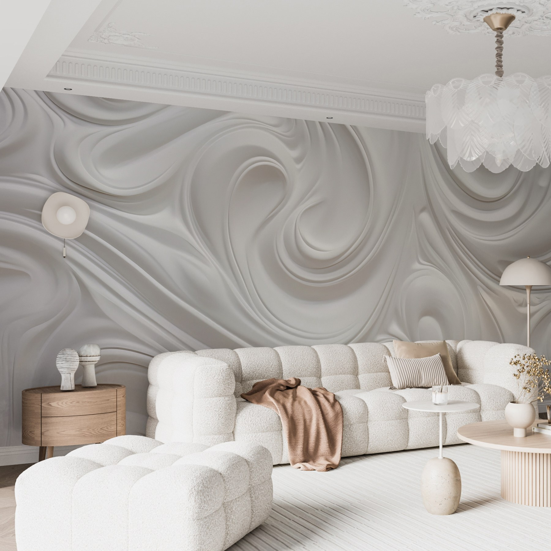 Transformați-vă spațiul cu această pictură murală, care prezintă un dans visător de vârtejuri albe. Este ca și cum ai aduce o briză blândă în interior sau un nor moale care te învăluie. Imaginați-vă că vă treziți pe acest fundal liniștit, simțindu-vă puțin mai ușor cu fiecare privire. Perfectă pentru orice cameră, aceasta echilibrează fără efort stilul modern cu o notă de fantezie. Este genul de pictură murală care ar putea inspira visele cu ochii deschiși sau ar putea stârni gânduri creative – bunăoară, idei de proiecte artistice! Ridicați acei pereți și lăsați farmecul formelor curgătoare să adauge un farmec unic casei dvs. Cine ar fi crezut că pereții pot fi atât de plini de viață?