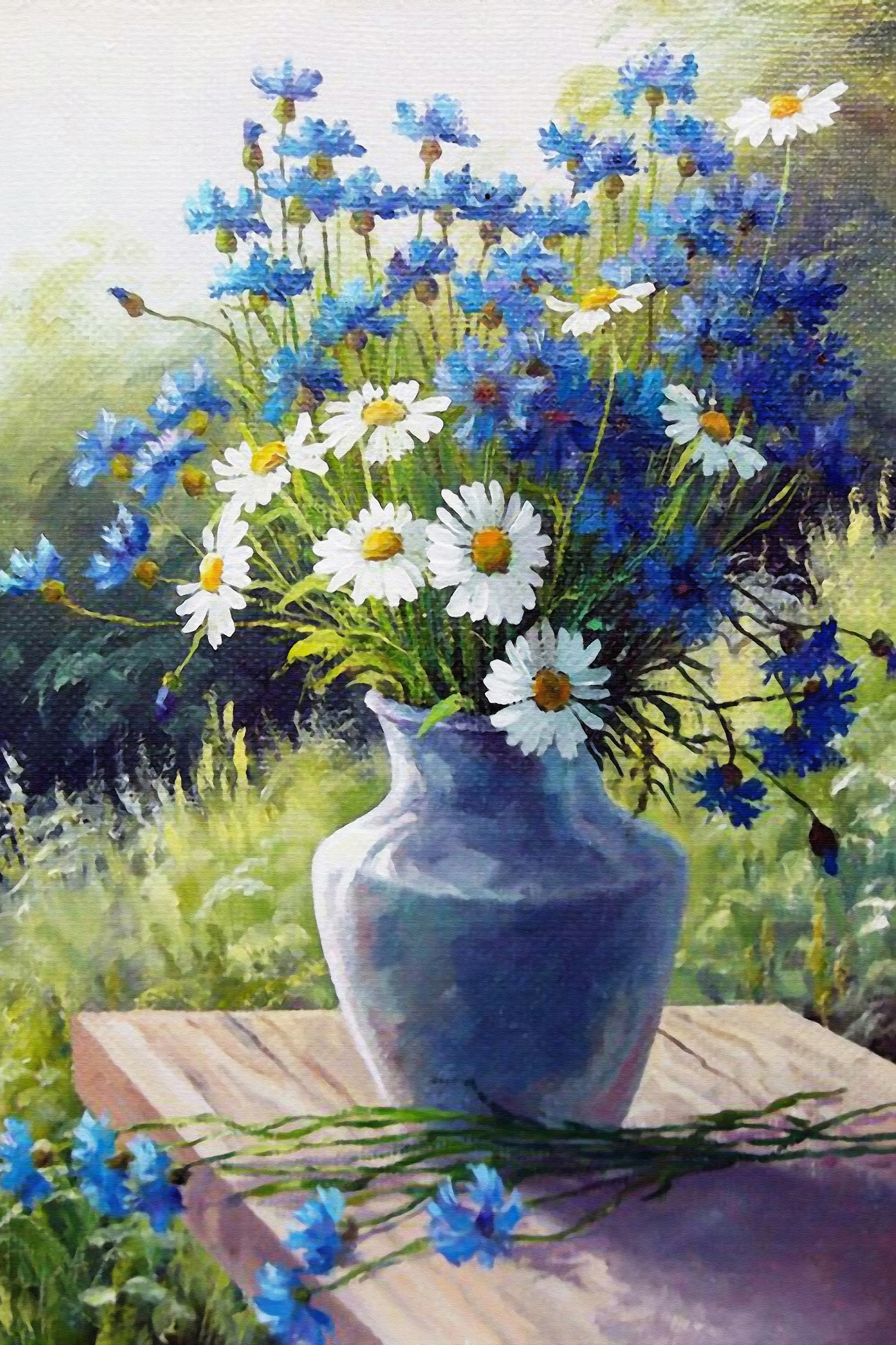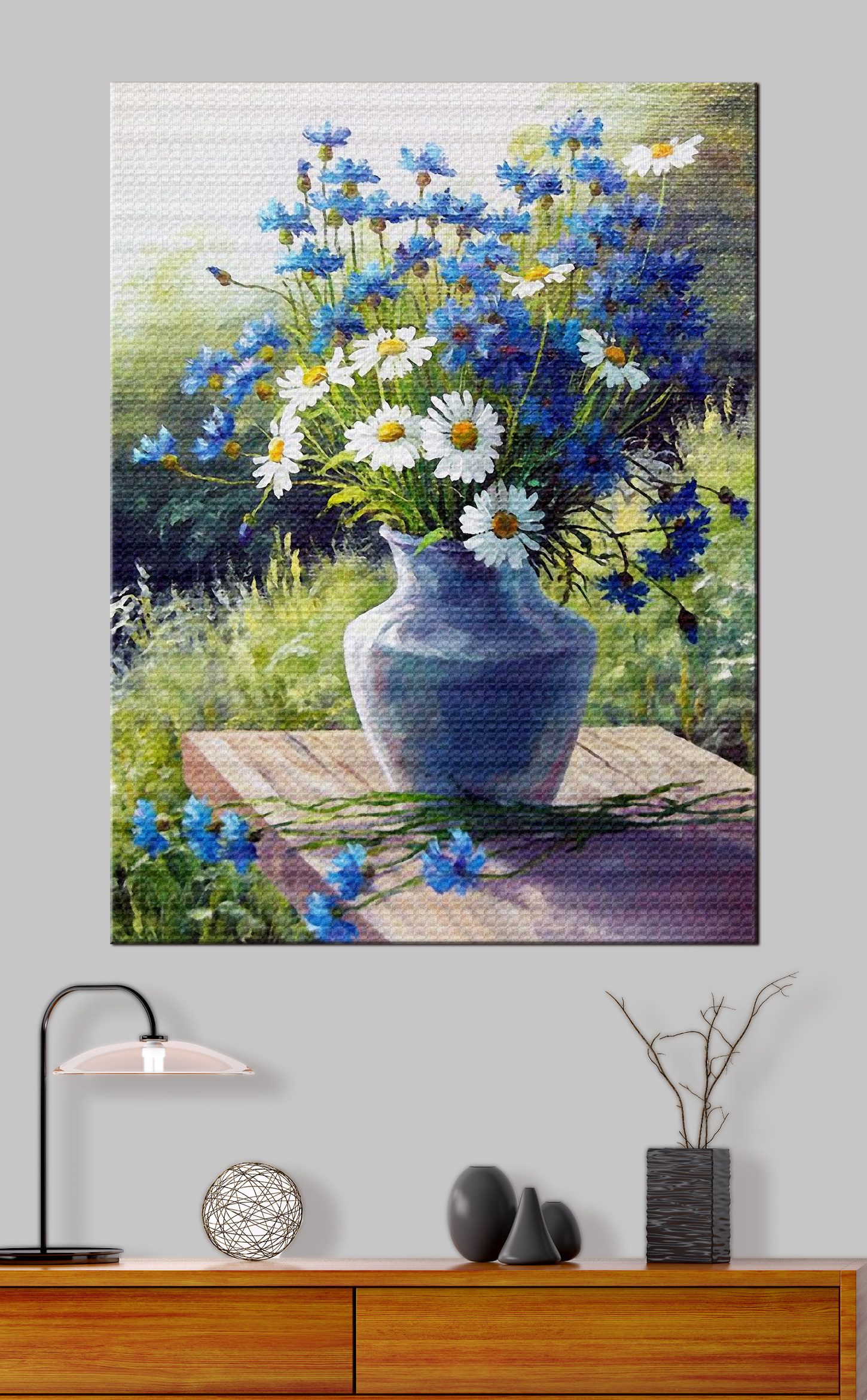 Imaginează-ți asta: o dimineață liniștită, lumina soarelui intrând pe fereastră, ricoșând într-o pânză frumoasă de albăstrele și margarete vesele într-o vază. Da, este atât de frumos. Acest print pe pânză nu este doar o explozie de culoare, ci spune o întreagă poveste. Perfectă pentru sufragerie, dormitor sau pentru acel perete singuratic pe care ai vrut să îl îmbraci. Acesta aduce un pic de natură în interior – fără polen! Nuanțele de albastru și alb ies în evidență pe un fundal verde blând, făcând florile să pară că s-ar putea legăna într-o briză ușoară. Fiecare privire la ea te face să zâmbești și să te simți puțin mai ușor, aproape ca și cum ai fi făcut o scurtă plimbare pe o pajiște de vară. Ribbit. Stai, astea sunt broaște. Bzzz. Acum sunt albine. Oricum, e ca primăvara pe pânză. Prietenos și primitor, exact ca o discuție cu un vechi prieten.