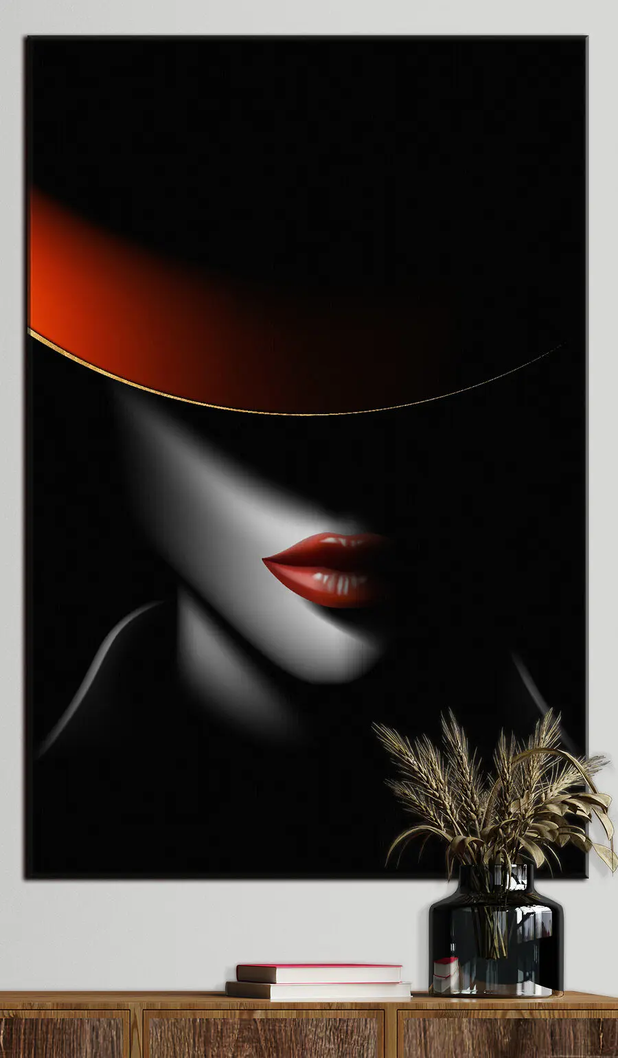 “Tablouri Mysterious allure under a shadowed hat” este ca un magnet pentru intrigă. Imaginează-ți asta: o față pe jumătate ascunsă în umbră, cu buzele pictate într-un roșu viu, luxuriant, care trage cu ochiul de sub o pălărie largă, întunecată. Este ca o șoaptă a unui secret pe care nu prea îl poți auzi, dar pe care vrei cu disperare să îl afli. Perfectă pentru un dormitor sau un spațiu de locuit, această piesă adaugă o notă de mister și eleganță. Serios, are un aer de film noir, ca și cum ai păși într-o scenă veche de film alb-negru. Puțină dramă, multă alură – este un starter de conversație și, crede-mă, toată lumea va dori să știe povestea din spatele acestor buze enigmatice.