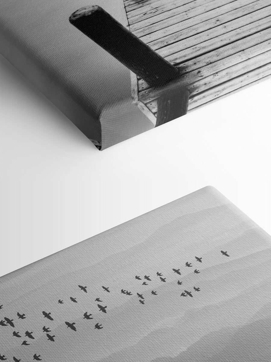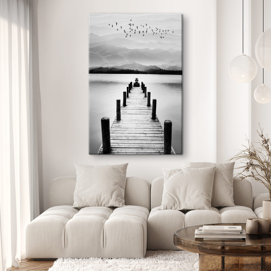 Imaginați-vă o dimineață liniștită lângă lac, o ceață blândă care se ridică în timp ce un stol de păsări își ia zborul spre cerul nesfârșit. Asta este ceea ce surprinde atât de frumos această imprimare pe pânză alb-negru. Perfectă pentru orice spațiu, scena senină poate face pe oricine să se simtă un pic mai relaxat și conectat la natură. Este un amestec izbitor de munți mohorâți și un lac calm – simplu, dar profund emoționant. Invitații dvs. s-ar putea opri și ofta, fermecați de liniștea pe care o șoptește această piesă. Fie că este lângă canapea sau în biroul dvs., cu siguranță va stârni visele cu ochii deschiși și conversația. O alegere atemporală pentru iubitorii de artă și călători deopotrivă.
