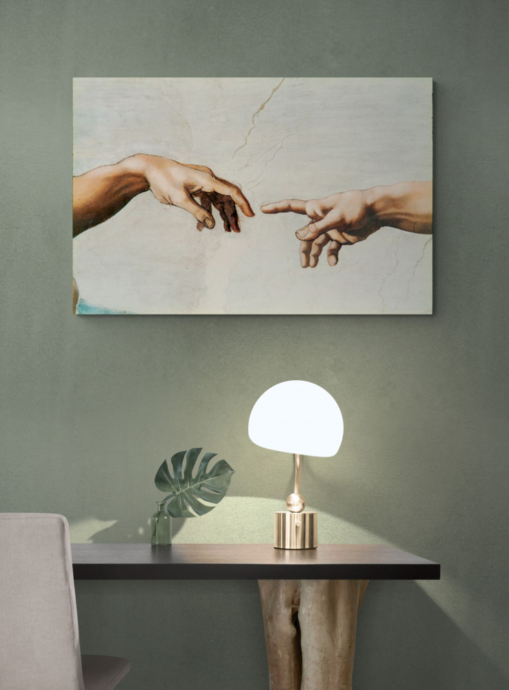 Imaginați-vă că aveți o bucățică de istorie a artei chiar în spațiul dvs. de locuit. Acest print pe pânză, “Fingers Reaching Towards Each Other”, se inspiră din nimeni alta decât capodopera lui Michelangelo. Da, este o felie din magia Capelei Sixtine – direct pe peretele tău. Este una dintre acele piese atemporale care trezesc ceva adânc în sufletul tău.