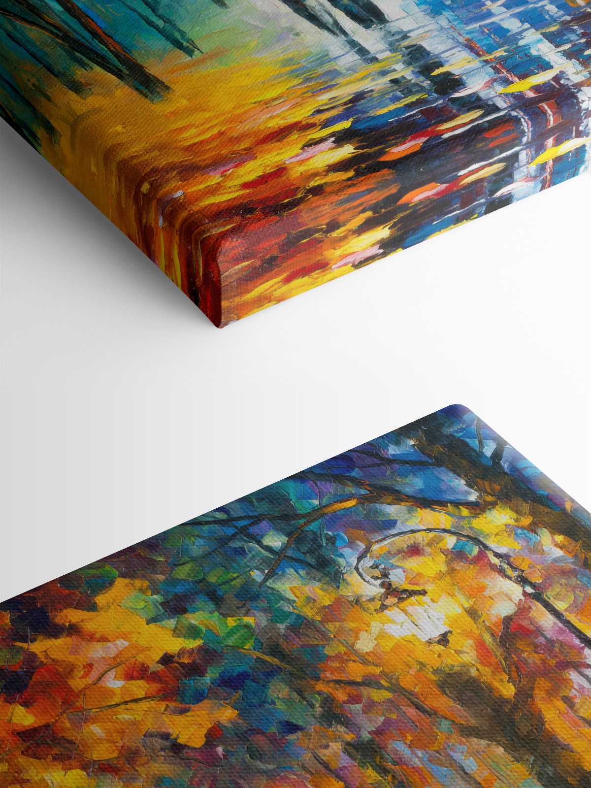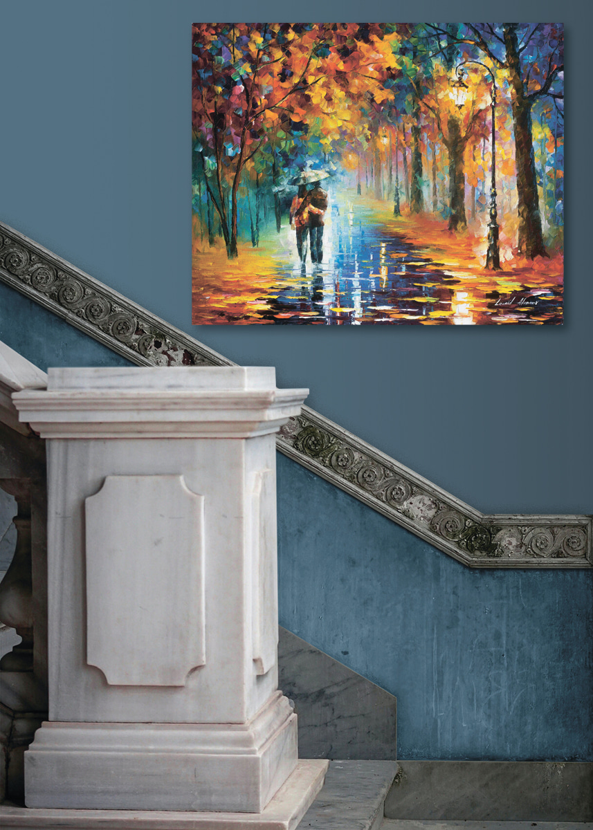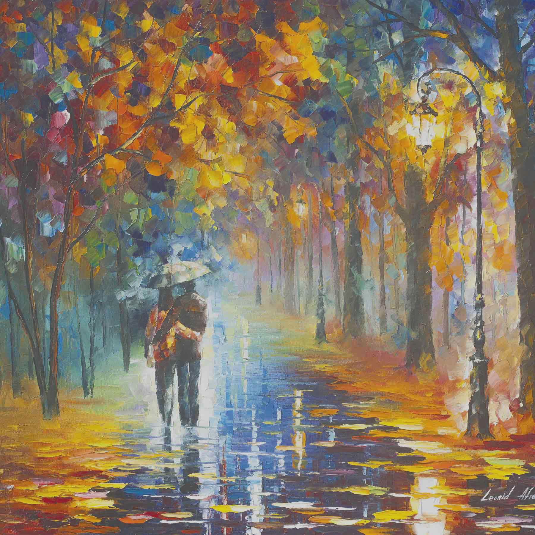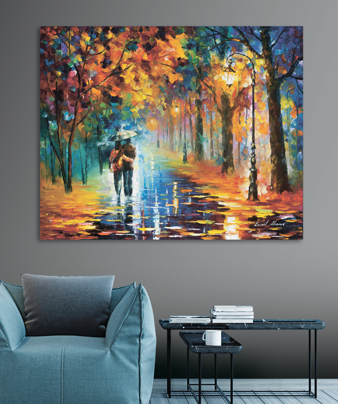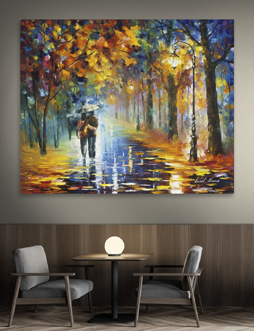 Aruncați o privire la această minunată artă pe pânză – o pictură care înfățișează un cuplu plimbându-se prin ploaie. Are o calitate visătoare, aproape magică, cu frunze strălucitoare și colorate împrăștiate peste tot și un stil impresionist. Umbrela? O atingere perfectă, care te face să te gândești la relaxarea alături de persoana iubită într-o zi ploioasă. Imaginați-vă acest lucru agățat în camera dvs. de zi – ridică instantaneu starea de spirit în zilele mohorâte! Este aproape ca și cum ai auzi bătăile ploii și ai simți acel sentiment de apropiere de fiecare dată când te uiți la ea. Perfect pentru a adăuga un strop de culoare și romantism oricărui spațiu.