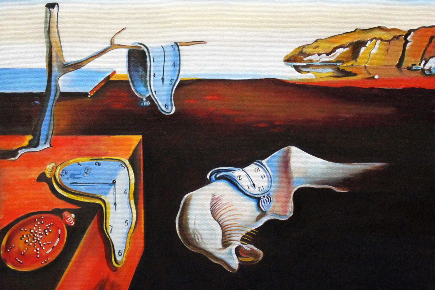 Scufundați-vă într-un peisaj de vis cu încântătorul “Melting Clocks in Surreal Landscape”. Această piesă de artă pe pânză surprinde dansul capricios al timpului, în care ceasurile se îndoaie și se răsucesc într-un decor viu, suprarealist. Imaginați-vă că agățați această lucrare în sufragerie – ce subiect de conversație! Este ca și cum ai avea o felie din Dali chiar pe perete, care te atrage într-o lume în care logica trece pe planul doi. Prietenii ar putea râde de modul în care un ceas distorsionat poate stârni dezbateri profunde despre timp și realitate. Lăsați această operă de artă să vă stârnească imaginația, făcând din fiecare privire o mică aventură. Perfect pentru cei care râvnesc la neobișnuit!